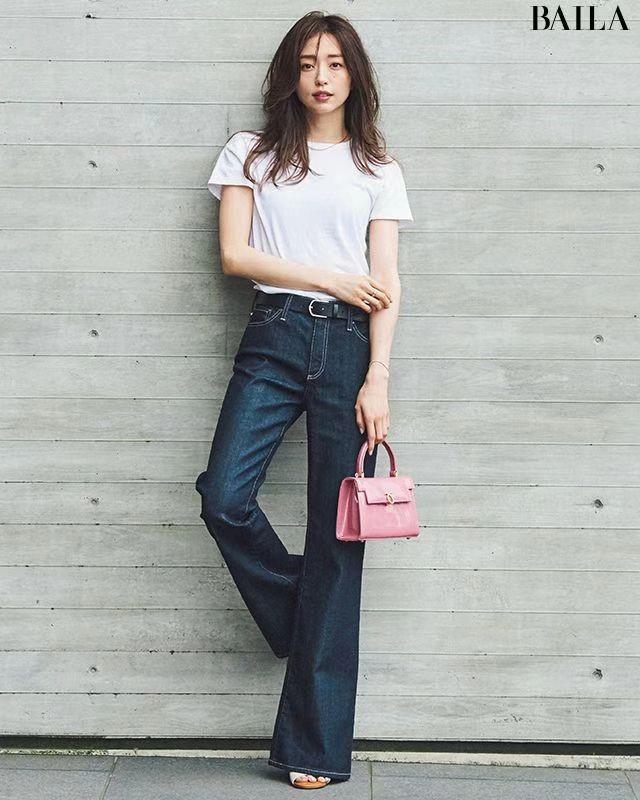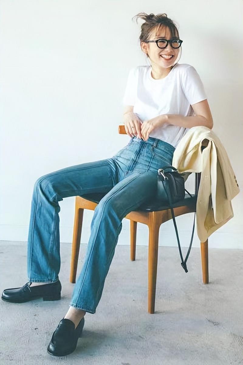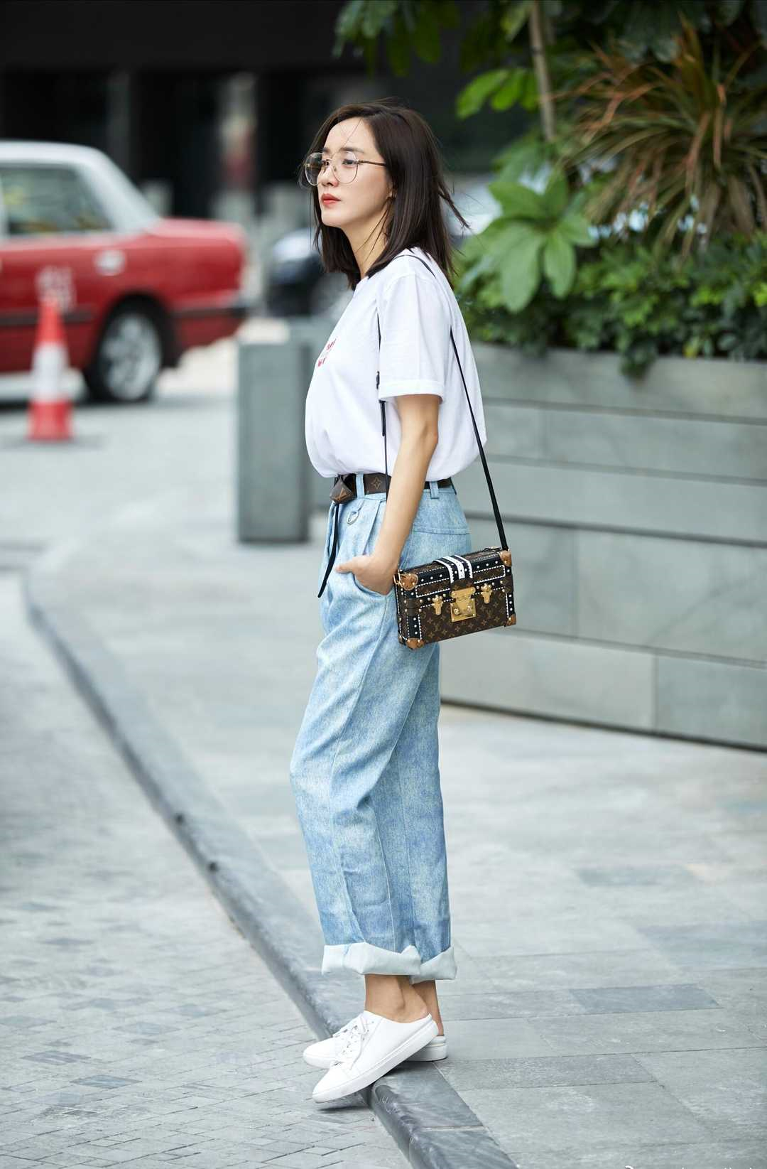 Nowadays, various styles of jeans are simply dazzling. The line cutting of many jeans has the effect of lengthening the legs, like this one Light blue high-waisted jeans with shaping lines are added to the surface. The wide-leg pants are more tolerant to the leg shape, and also have the effect of visually lengthening the legs. Paired with a pure white T-shirt, it is simple and refreshing.