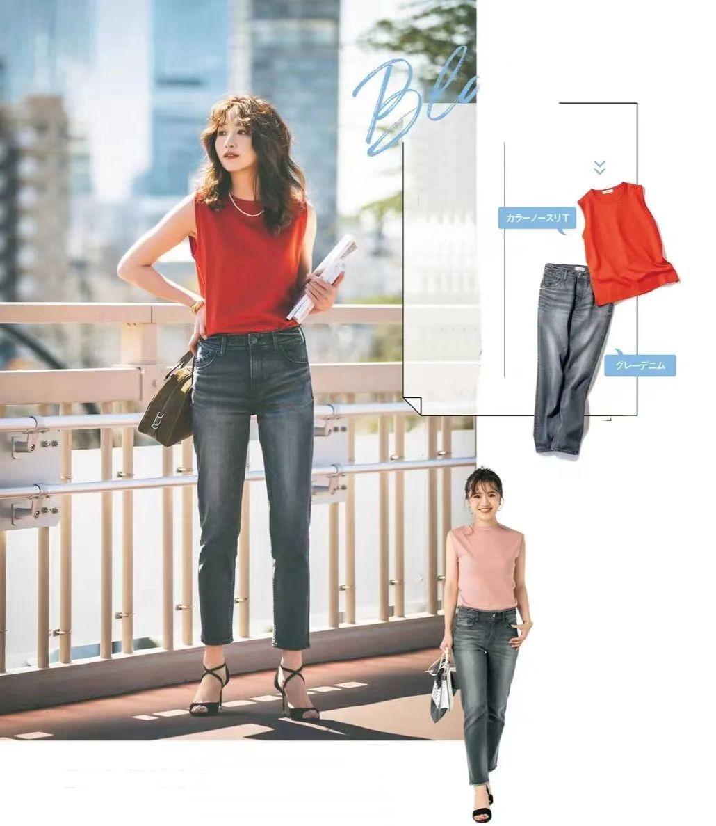 The cuts and designs of T-shirts are becoming more and more diverse. If you want to wear them with a refreshing feel, it is recommended that you choose this sleeveless style top. It is a brick red top. After the upper body is put on, it will appear whiter and brighter. Pair it with a slender collar around the neck. The pearl necklace makes it more delicate and delicate. The smoky gray denim nine-point pants on the lower body lengthen the legs and make them look slender and straight. Paired with black cross-strap fish-mouth high-heeled sandals, it is very elegant and generous.