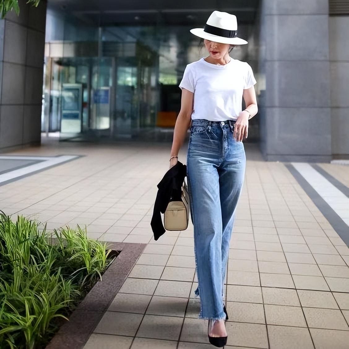 Many mature women want to wear something simple and elegant in summer. This convenient and practical trousers combination can meet this demand. Use a solid white T-shirt, high-waisted denim wide-leg pants and high heels. , elegant and generous.