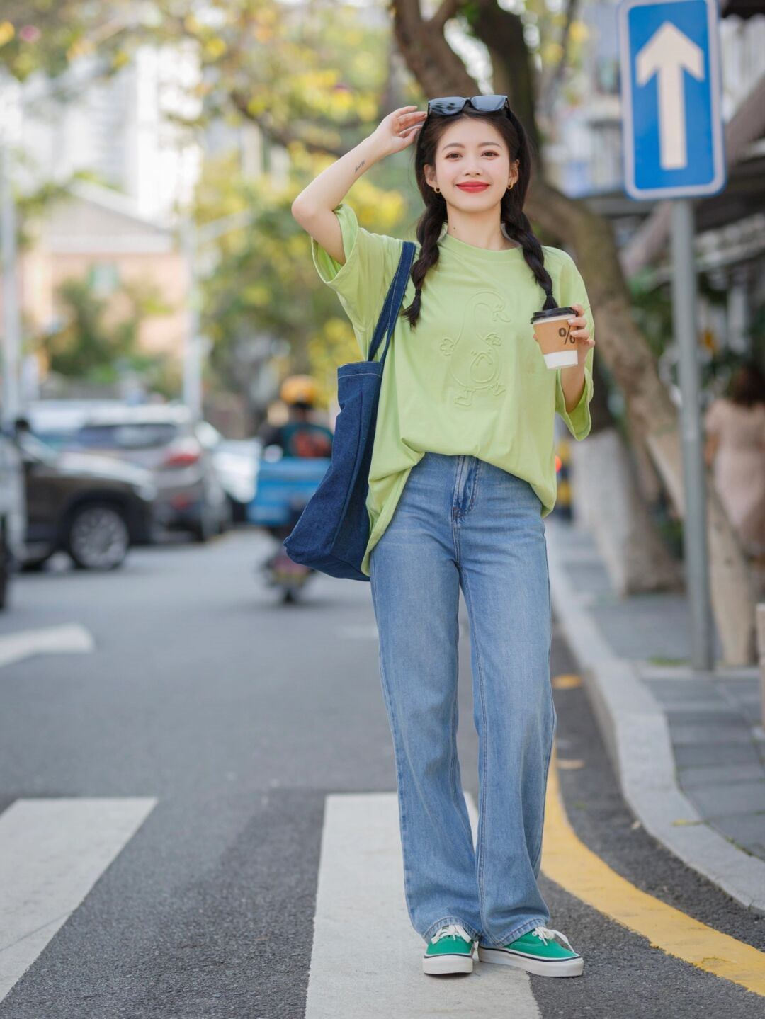 Green items are particularly suitable for wearing in the summer. They look white and reduce age. Like this loose-fitting grass green printed T-shirt, it looks cute. The duck pattern brings a sense of childlike interest to the look. Paired with light blue denim wide-leg pants and coriander green canvas shoes, it is casual and fashionable.