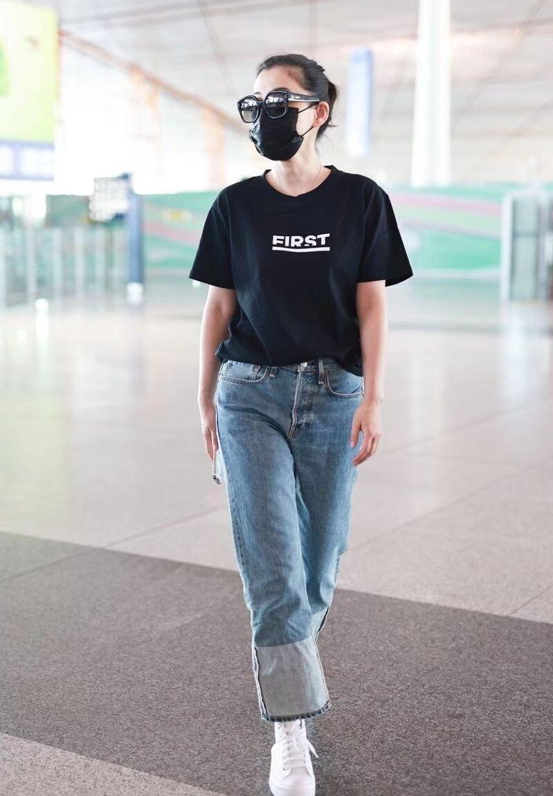 Many mature women choose to wear It needs to be more refreshing and elegant. For example, in this airport private outfit, a black printed letter T-shirt is paired with light blue nine-point jeans. The overall combination is very casual and simple, which can highlight the low-key and simple temperament of the wearer. Paired with white shoes , more casual and age-reducing.