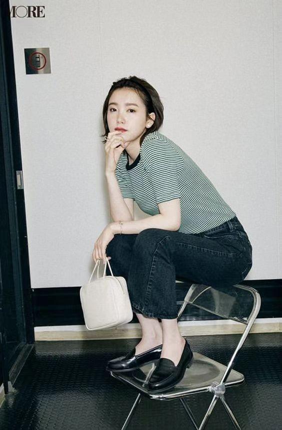 The black and white striped T-shirt with small stripes is more elegant than the thick striped design. The lower body is paired with smoke gray denim. Nine-point pants and small leather shoes make your legs look longer.