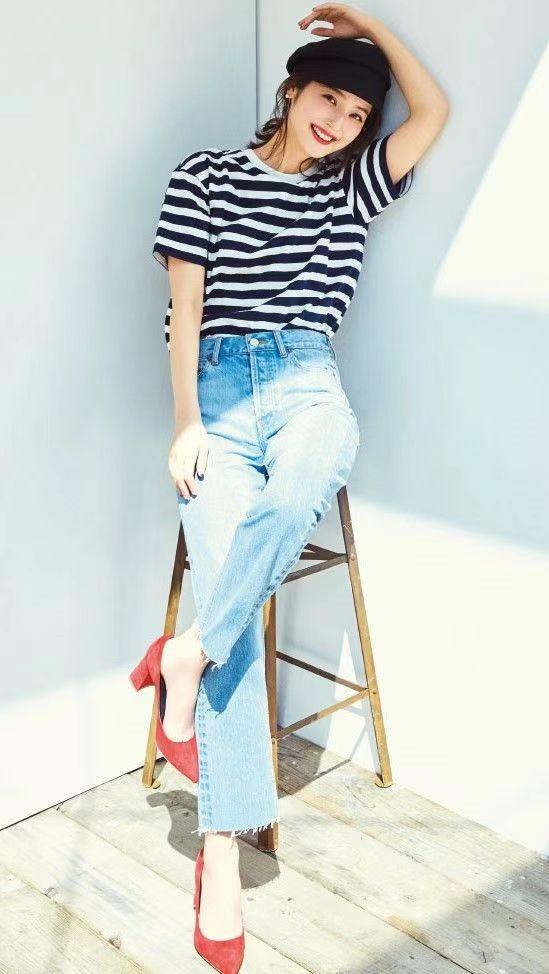 T-shirts with striped elements can be said to be something that many women never tire of wearing in the summer. They use black and white striped items paired with solid-color light-colored jeans. Personalized and fashionable, accessories such as red high heels and a black newsboy hat can enhance the sense of sophistication.