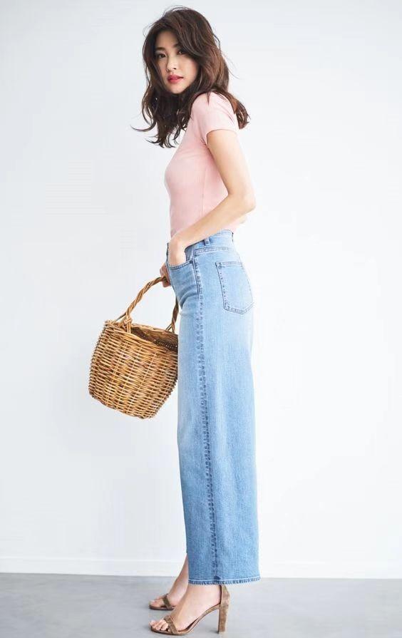 Although light blue jeans can create a softer style, it is very easy to make the legs appear thick after the upper body. If you want the overall match to be more gentle and appear If you are young, you can wear this light pink tight T-shirt on your upper body, which not only highlights your good figure but also makes you look extra girlish.