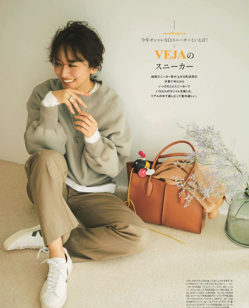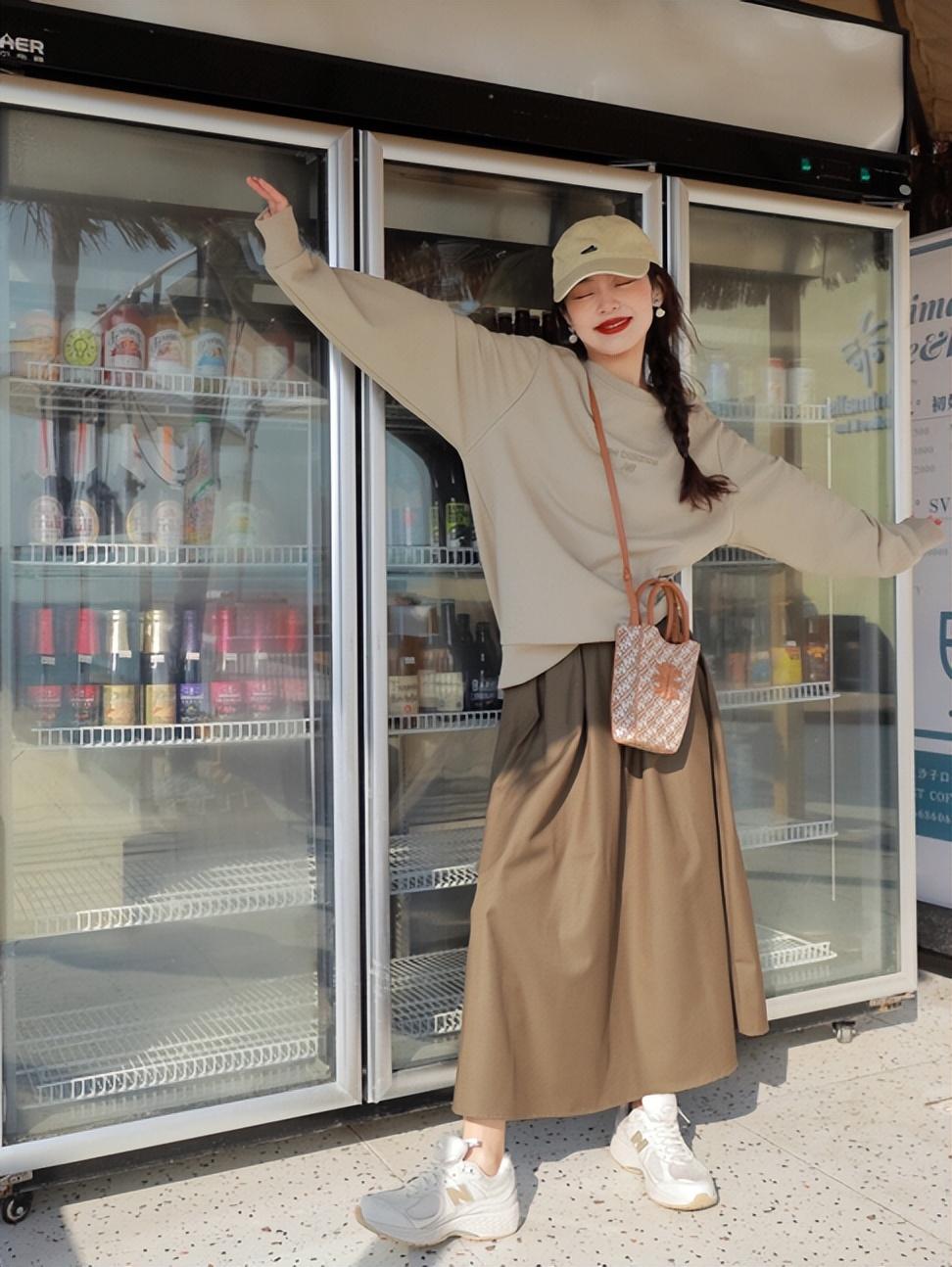 Sweatshirts can also look sweet and cute. Pairing a sweatshirt with a skirt can create a beautiful and sassy effect. This look is an earth-toned look. A light khaki sweatshirt is paired with brown For a skirt, you can slightly tuck a corner of the sweatshirt into the skirt to show off your waistline. Then pair it with a pair of white sneakers to look like a Korean high school girl. The overall look is casual and very trendy.