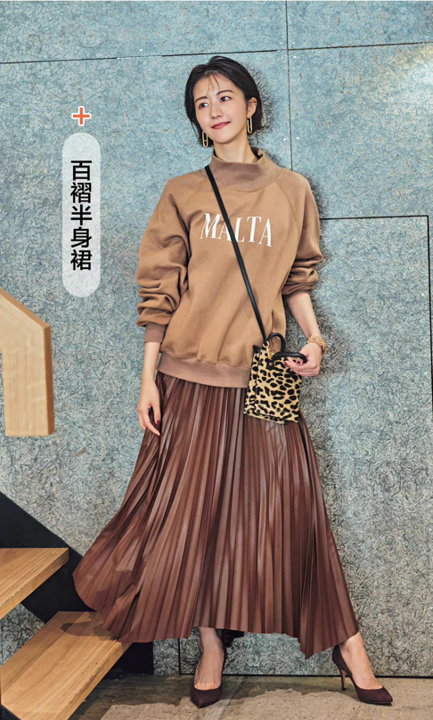 When a sweatshirt is paired with a pleated skirt and high heels, it immediately becomes mature again Temperament. In this look, a khaki turtleneck sweater is paired with a brown irregular pleated skirt, easily interpreting the charm of a light, sophisticated and intellectual woman!