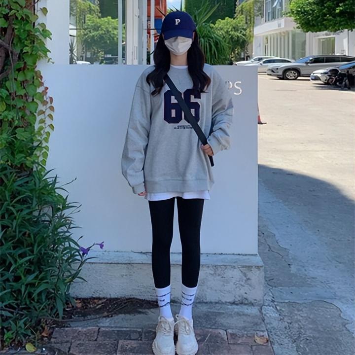 In this look, a white tee is worn under a gray sweatshirt, and then matched with a pair of black leggings. The whole person looks slender and slender, allowing the advantages of the figure to be shown, and the eye-catching effect and slimming effect of the outfit will be very good.