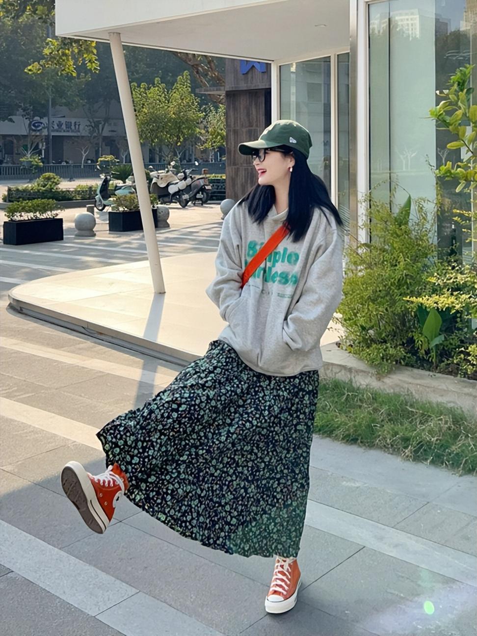 Sweatshirts and floral skirts are also a versatile combination. Sweatshirts and skirts are both figure-friendly items, and they can create a lazy and casual tone no matter who wears them~