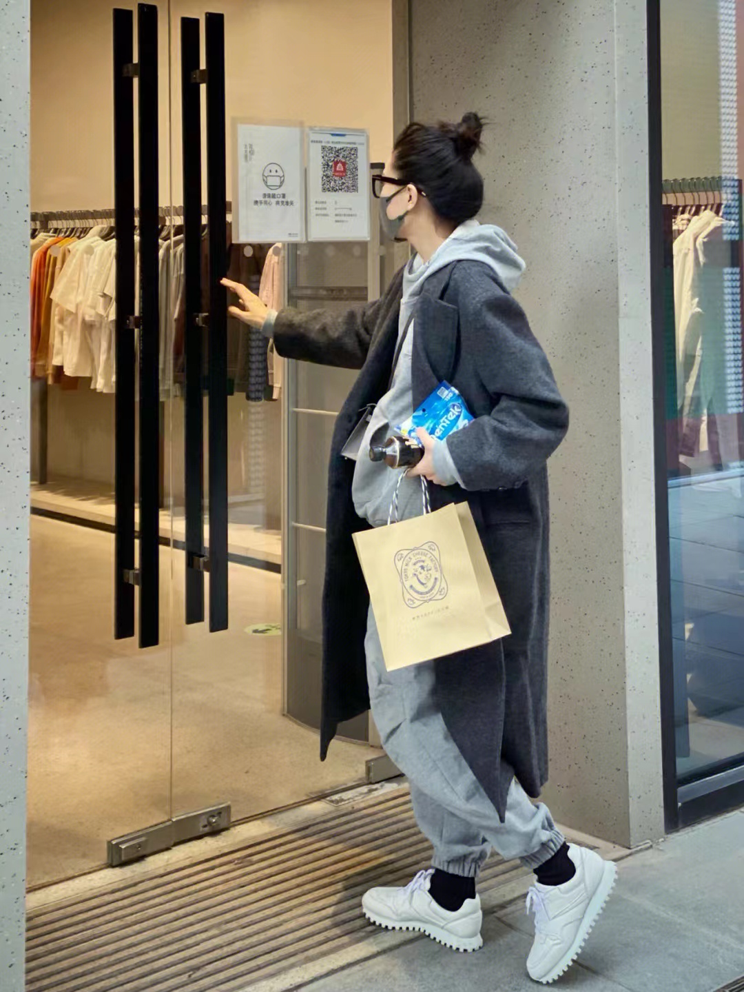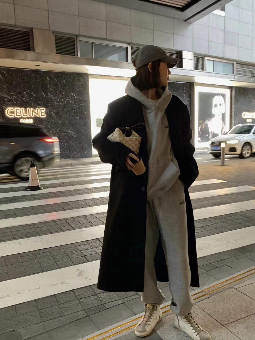 This kind of set of sweatshirts and pants is also very fashionable. The gray sweatshirt and sweatpants create an overall coordinated style, and then paired with a long black coat, which is both casual and warm.