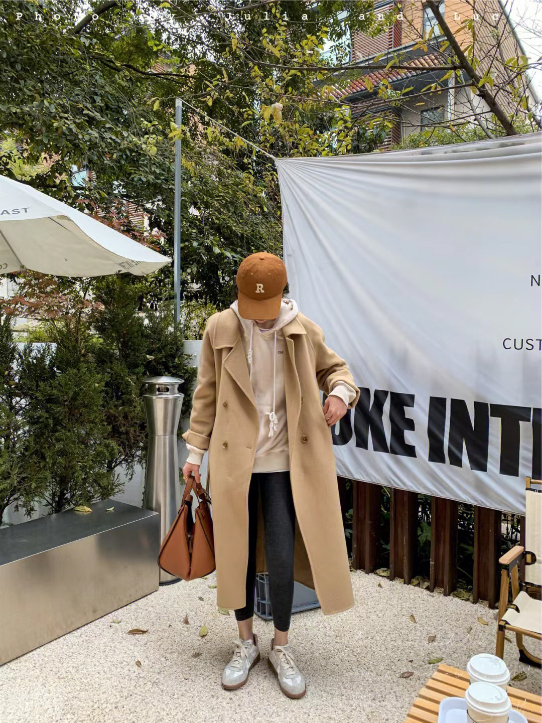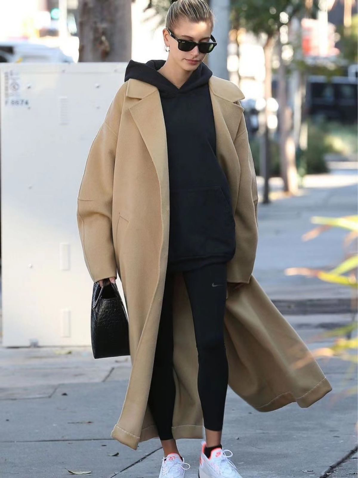 Tightening up and loosening down can be said to be a basic principle that runs through our autumn and winter outfits. When we combine a coat and a sweatshirt, we can choose yoga pants. Single product. In this look, a khaki coat is paired with a sweatshirt of the same color, and then paired with a pair of black yoga pants and sneakers. The whole look has an urban casual style.