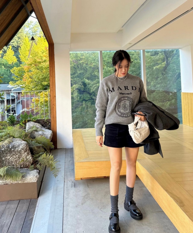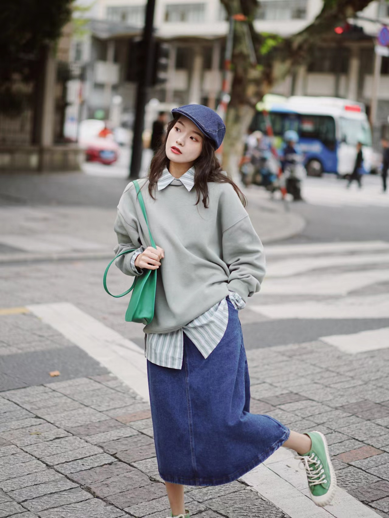 If you feel that a sweatshirt and skirt alone are not layered enough, you can add a handbag, a necklace, or layer a shirt with the sweatshirt to enrich the layering. For example, this combination adds a blue and white striped shirt to a gray sweatshirt, paired with a denim skirt, which is full of student style and gives a boyish look.
