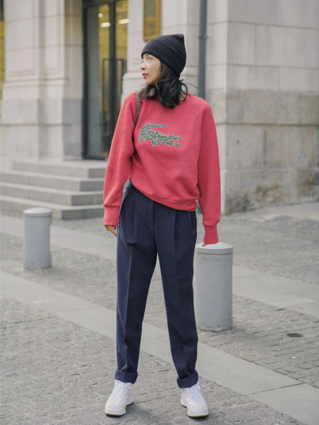I think there is no combination that is more casual and fashionable than a sweatshirt and sweatpants. In autumn and winter, sisters who are afraid of the cold must choose a sweatshirt with velvet, While retaining warmth, it can also be worn with style. Sisters who feel that solid color sweatshirts are monotonous can choose printed ones, but they should pay attention to the appropriate complexity and simplicity. If the sweatshirt has a design, the lower body sweatpants can be mainly solid colors.