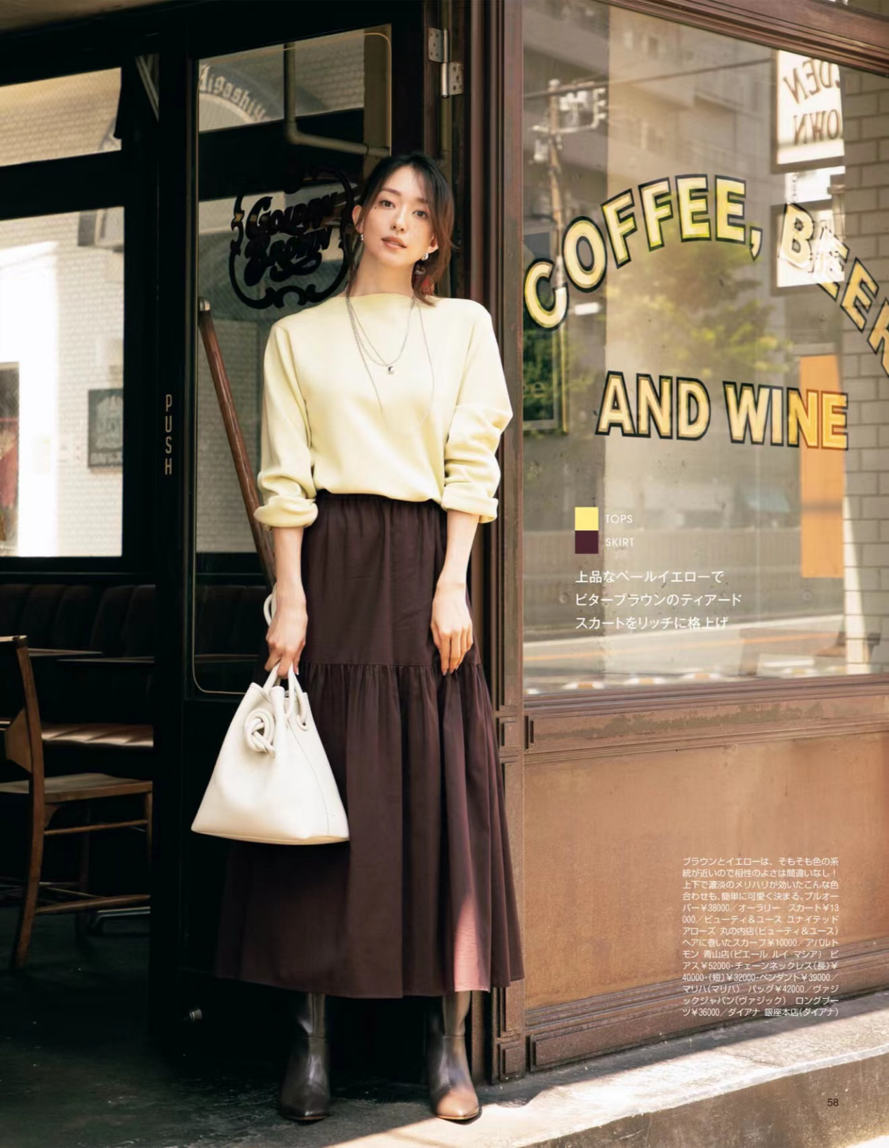 In addition to the same color system, I also recommend matching similar colors. Mika, gray blue, gray pink, and black gray are all popular color combinations in autumn and winter. Like this set of beige pullover sweatshirt + dark coffee skirt, it is full of late autumn atmosphere. Paired with a handbag, it is retro and exquisite. It is very suitable for sisters who follow the retro literary style.