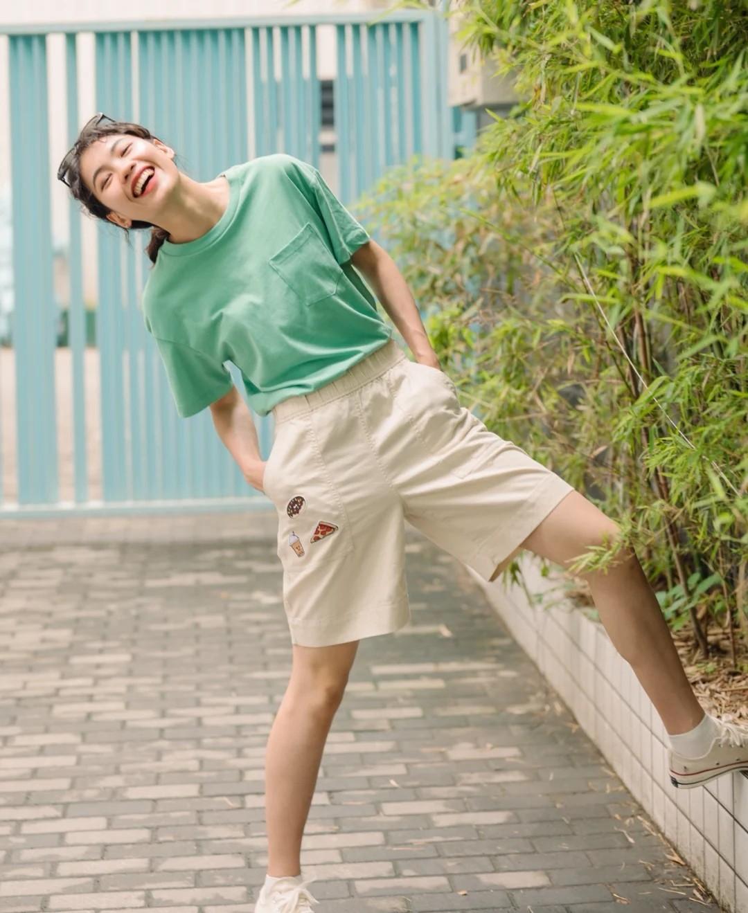 A loose T-shirt with a workwear feel like the one in the picture is a very good choice, and the color matching is also very harmonious, green and white are lively Eye-catching, very age-reducing.