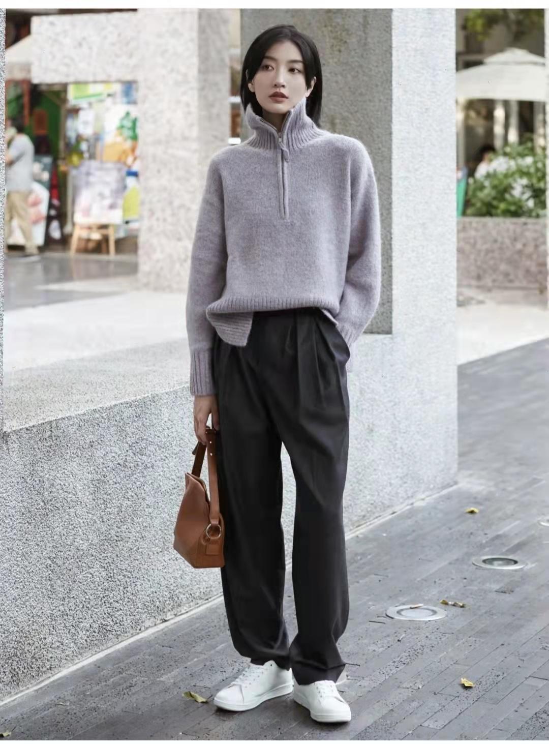 Gray pants outfit:Pair it with textured basic design items to be comfortable while exuding a touch of French laziness. The top is a gray-purple zippered turtleneck sweater, The zipper high collar design is really not too much Excellent, the lower body is a classic combination of gray suit pants + white sneakers, which instantly injects a very formal outfit with a French leisure soul.