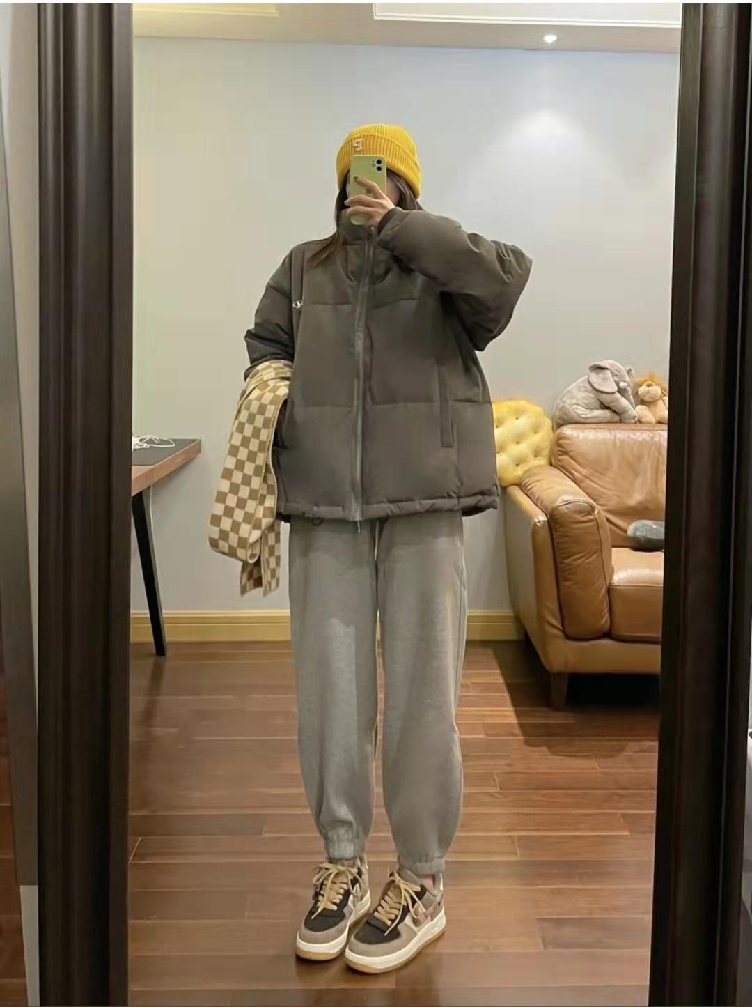 Gray pants outfit: Gray down jacket Boyfriend style is very safe and is a genderless style. This gray texture is full of texture, and it goes well with the gray leggings sweatpants. It has a Korean street style. It would also look great if paired with black shark pants and white mid-calf socks.
