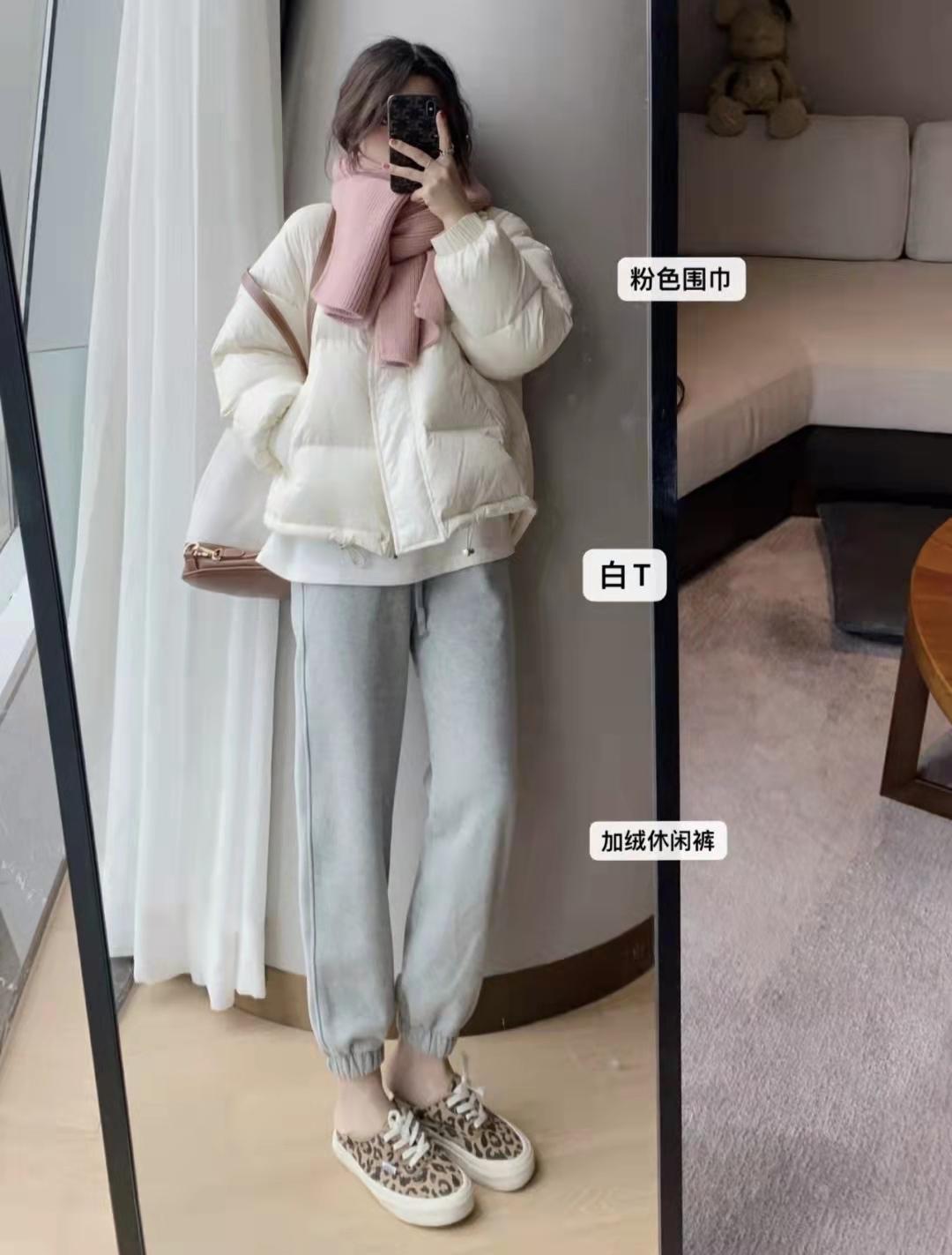 Gray pants outfit:Down jacket paired with sweatpants looks so good! The upper body of this off-white down jacket is nice and warm, with a white T-shirt underneath. The lower body is gray leggings sweatpants, and the ankles are exposed wearing fashionable leopard print canvas shoes.