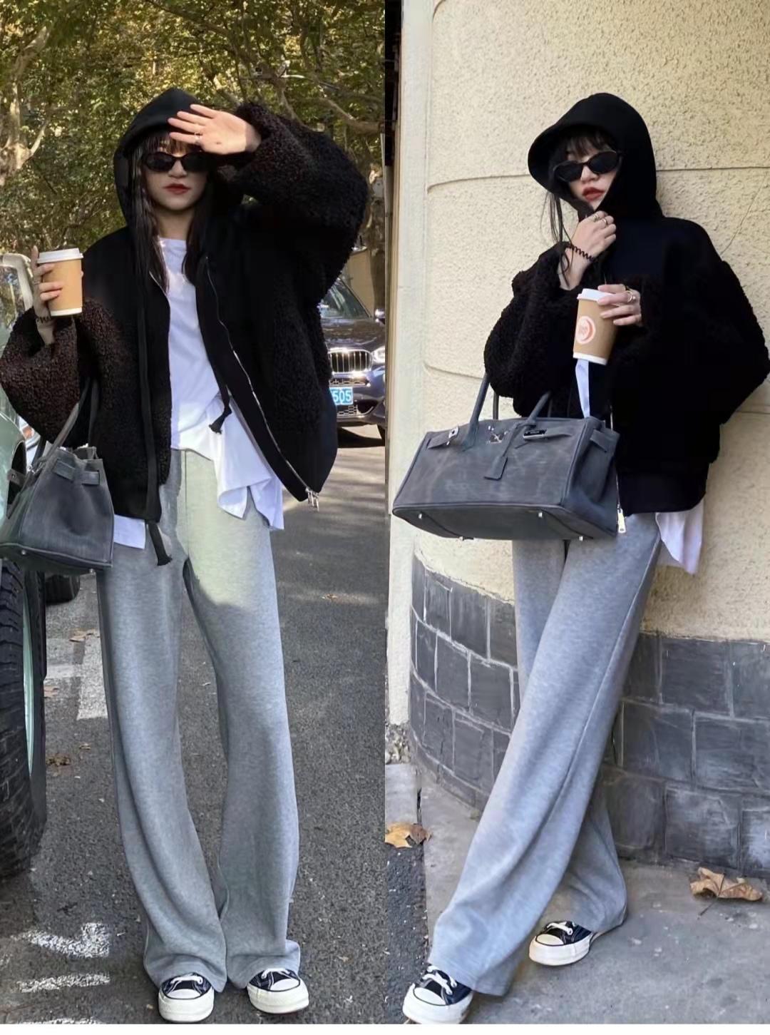 Gray trousers to wear: A black jacket is versatile in both color and style, and is very thick. Wear a base layer underneath to survive the winter, and a white T-shirt front piece underneath. It is an asymmetrical design, and the lower body is matched with gray wide-leg pants.This length makes the legs look longer + very flattering to the leg shape.