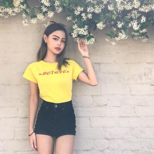 Yellow is a very dazzling color. It is safest to match it with colorless colors such as black, white and gray. Black and yellow have a very good effect. Black shorts are a must in summer. One of the must-have bottoms, they are very versatile, no less than denim shorts. The slim yellow T-shirt is paired with black high-waisted shorts, which not only shows off your sexy figure, but also makes you look very energetic.