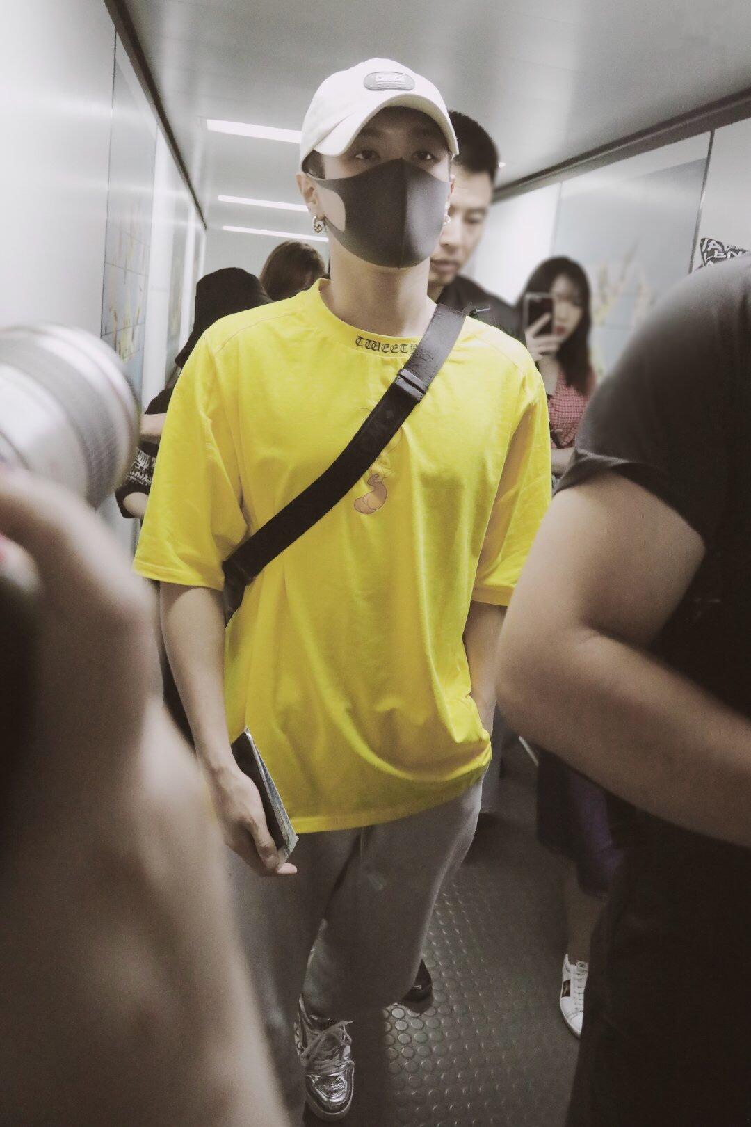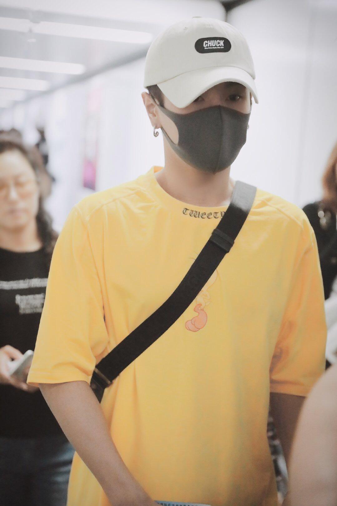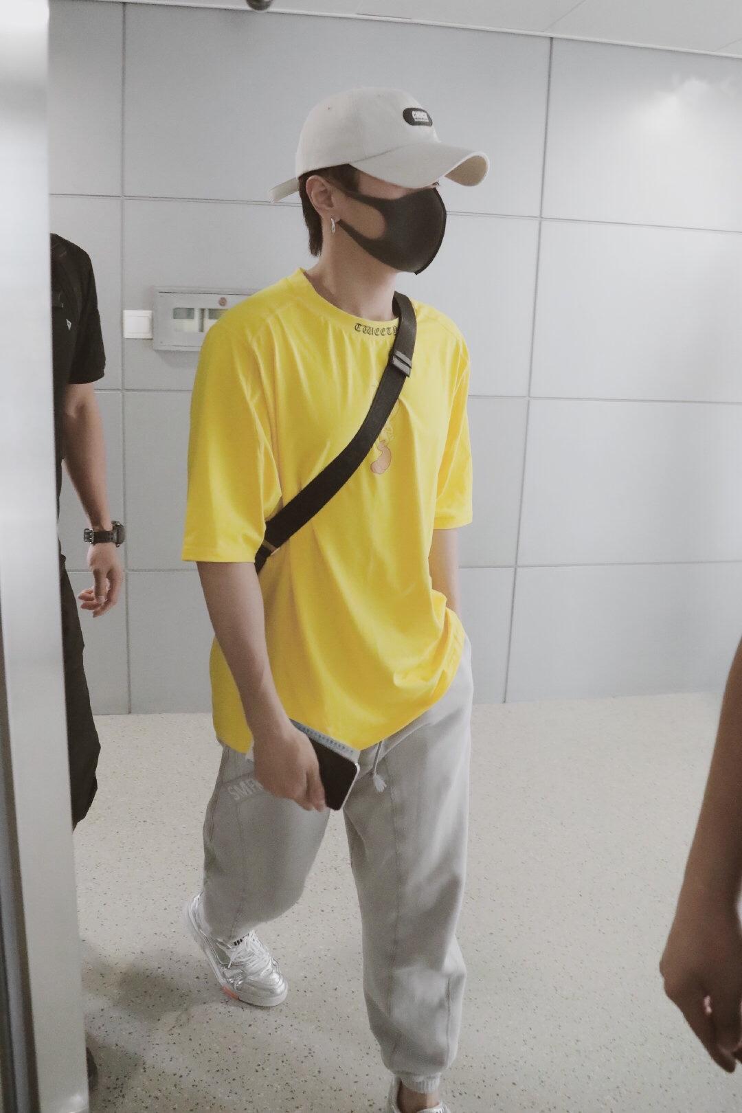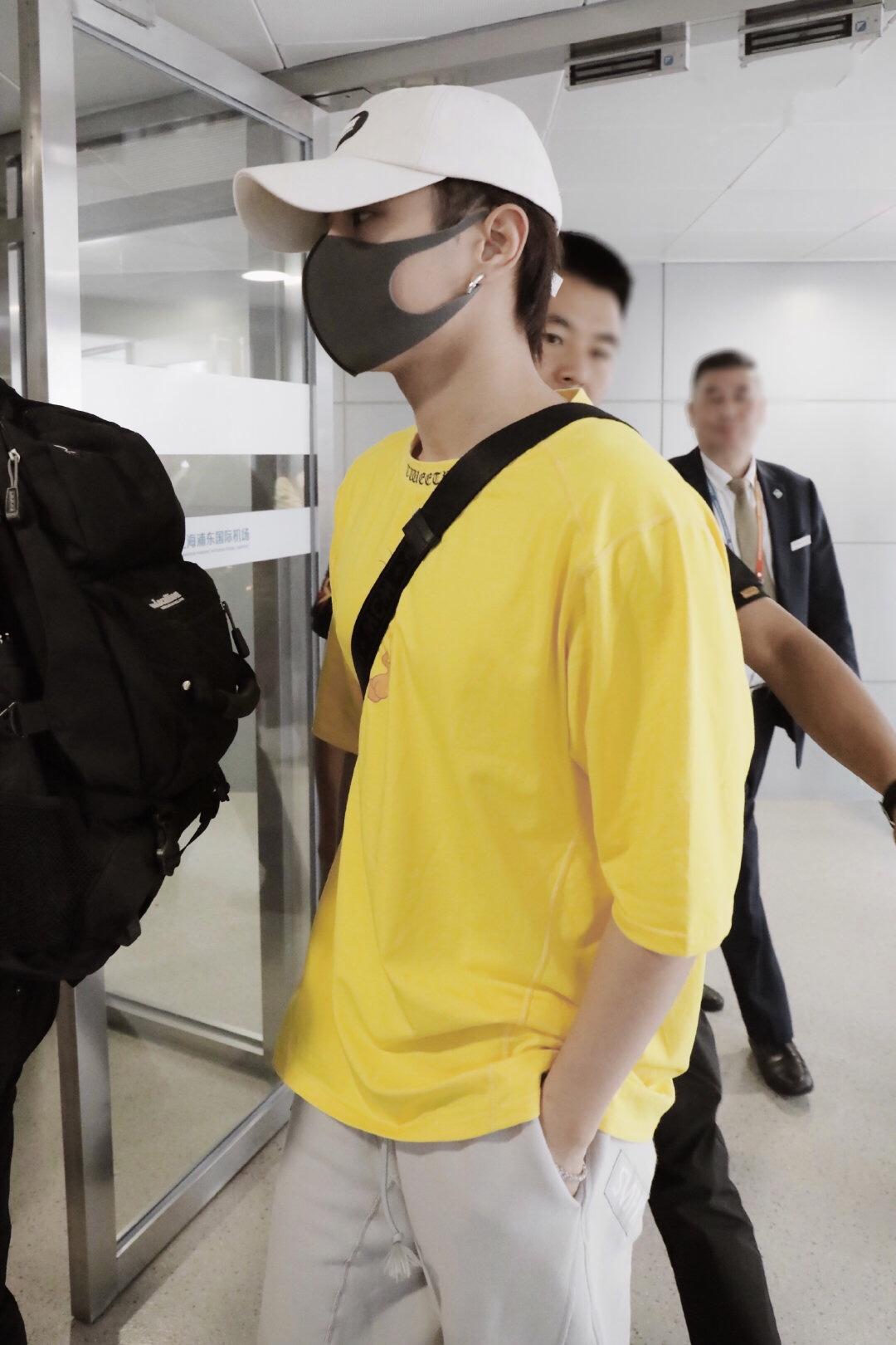 Li Wenhan appeared at the Shanghai Airport in a casual outfit, exuding youthful vitality. He chose a bright yellow T-shirt decorated with cartoon patterns. The circle of characters on the collar added a touch of coolness to him, giving him a very summer feeling overall.