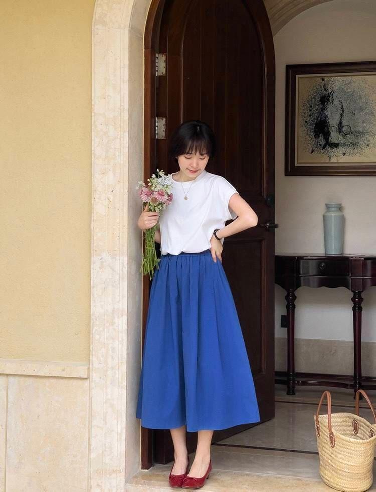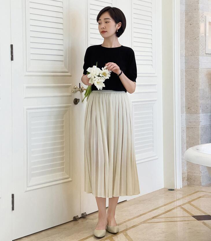 If you want to look younger and sweeter, we can use a T-shirt and a pleated skirt. The pleated skirt itself is a relatively obvious style item. The multi-layered pleats make the skirt more elegant. It looks smart and elegant, very girly. A simple T-shirt combined with a pleated skirt will be more suitable for the intellectuality and gentleness of middle-aged women, and will not make people feel “pretentious”. We also need to pay attention to the coordination of colors in this set of matches. Whether it is a pleated skirt or a T-shirt, try to use high-end colors.