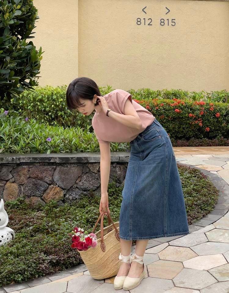 T-shirt and high-waisted washed denim skirt The combination is also very exciting. In this combination, we pay more attention to the coordination between fabrics. For the T-shirt fabric, we need to use high-density, good breathability and light weight, which is comfortable to wear and looks good. It looks good.The popular threaded cotton is very suitable. It feels delicate and soft, and Breathable and sweat-absorbent, it is very comfortable to wear in summer.Paired with denim fabric, it is a perfect match between the two The contrast between soft and hard will make the look look layered.