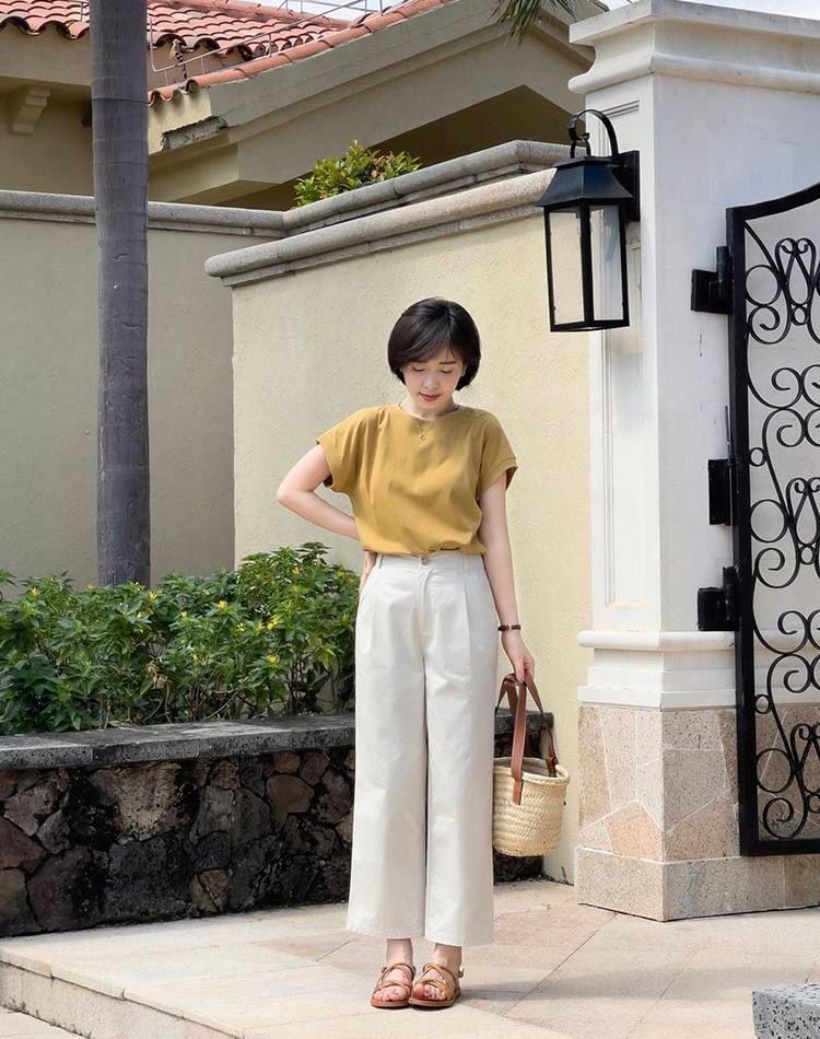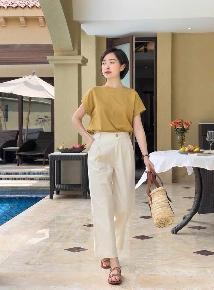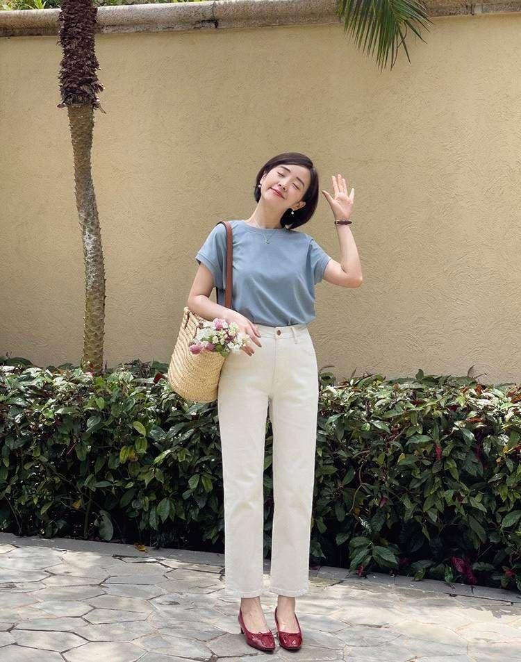 The blogger’s outfit in the picture will make people feel simple and high-end. This style is still very suitable for middle-aged women who are commuting to work. The outfit in the picture is a round-neck short-sleeved T-shirt and high-waisted straight pants. The combination of top and bottom leaves space between the clothes and the skin, making it look very breathable. The nine-point design of the pants is also worth mentioning. If we choose ten-point pants, it will make these The look of the suit looks very ordinary, but the exposure of the ankles not only makes it look taller, but also makes the overall look echo up and down, making it complete.