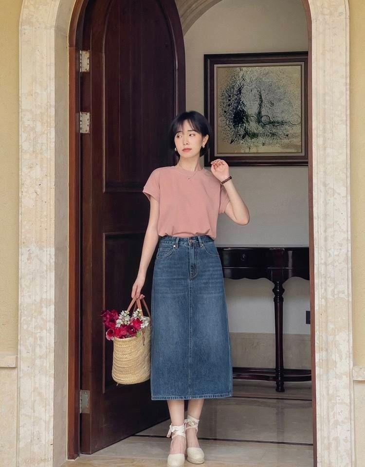 3. T-shirt + denim skirt