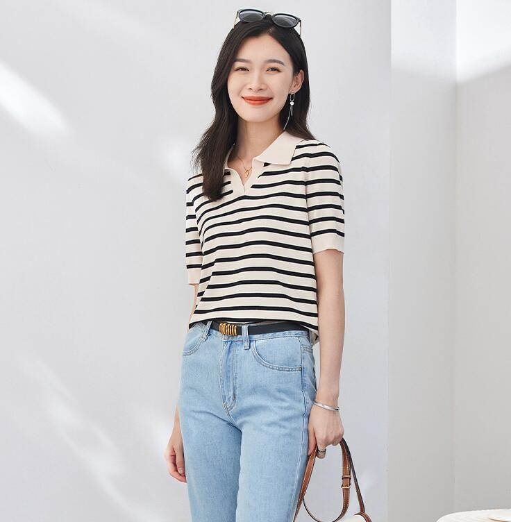 Knitted POLO shirt is a favorite type of many fashionistas.Fine knitted fabric It gives the simple POLO shirt a bit of high-end texture, and the soft material also adds a bit of gentleness and romance, so it is very suitable for women who want to wear a gentle style. It is recommended to pair it with a skirt for a better effect. Even better.
