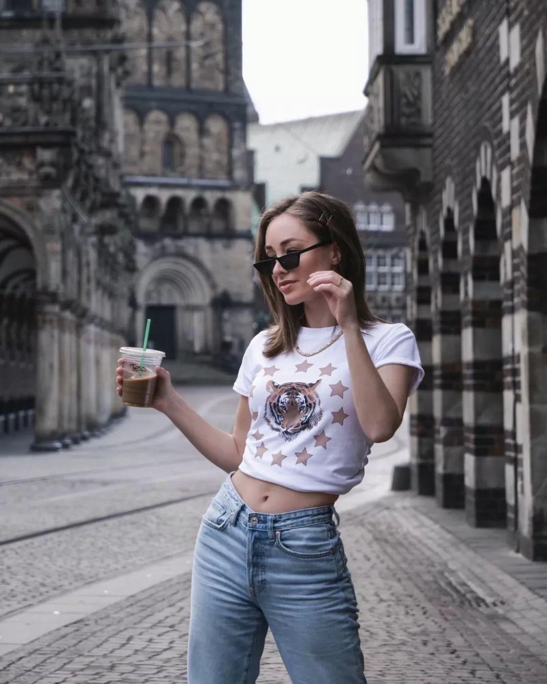 If you feel that tucking in the hem of a white T-shirt will make your bottoms look a bit crowded and rushed, thentuck in a small corner It’s also completely possible, and it can also highlight the waistline.
