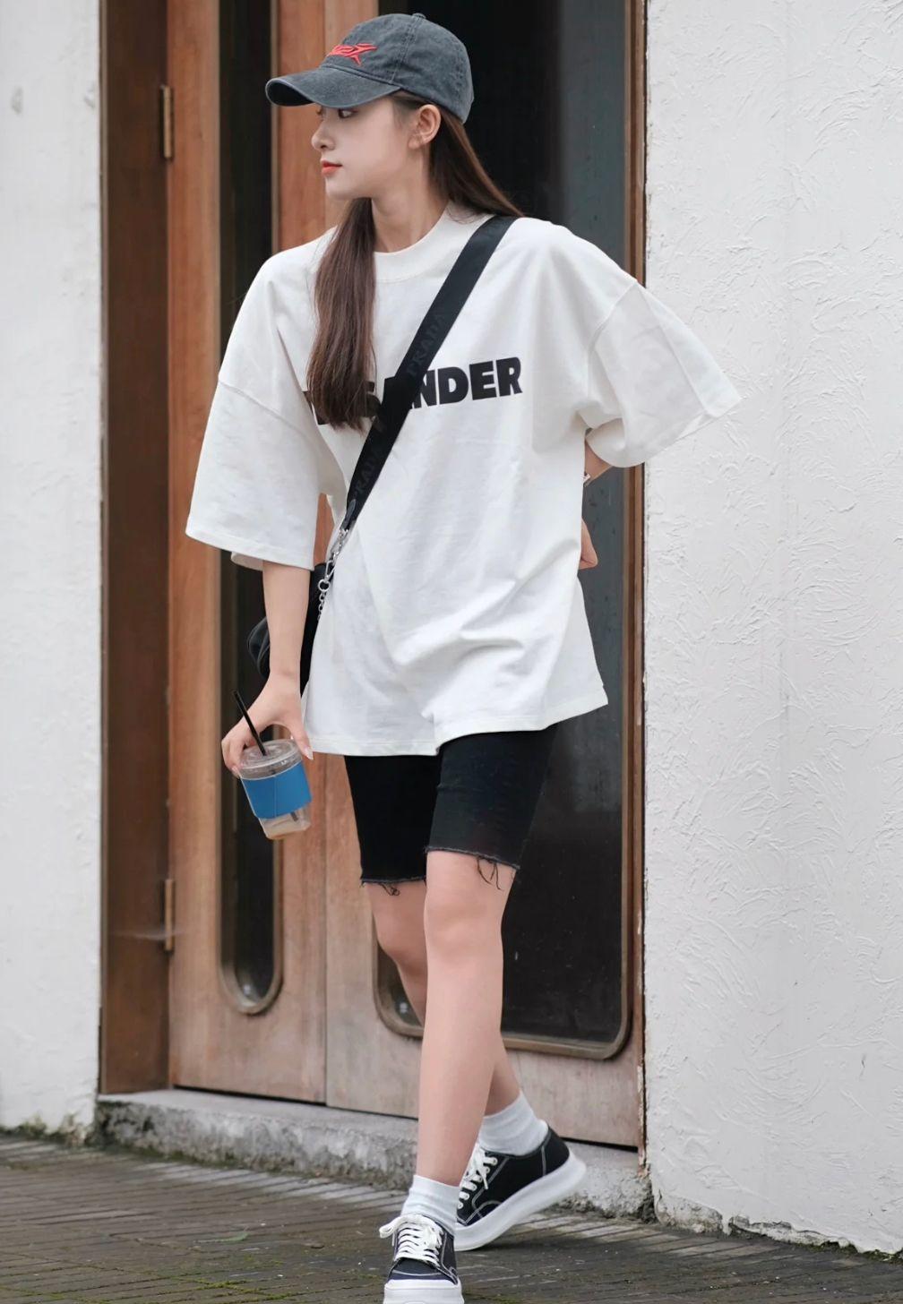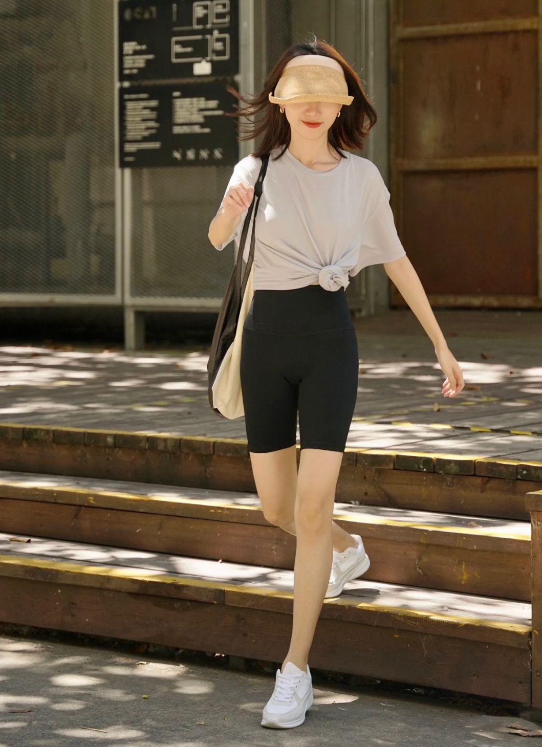 T-shirts and cycling pants are relatively versatile and attractive clothing, especially loose and large T-shirts , there is not much difficulty in dressing, and it also shows great figure advantages when paired with cycling pants. Regarding cycling pants, they were originally pants worn by athletes when riding bicycles. Because of the special fabric, compared with ordinary pants, they are more breathable and comfortable in summer. They are worth trying.