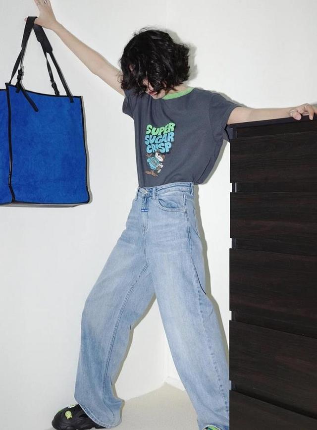 Didn’t know you had I haven’t noticed that this kind of denim wide-leg trousers is very popular this summer. The floor-length trousers really lengthen the legs when worn, and will not give people the impression of being put down at all. The upper body is matched with a gray short-sleeved T-shirt. This outfit looks very comfortable, casual and casual.