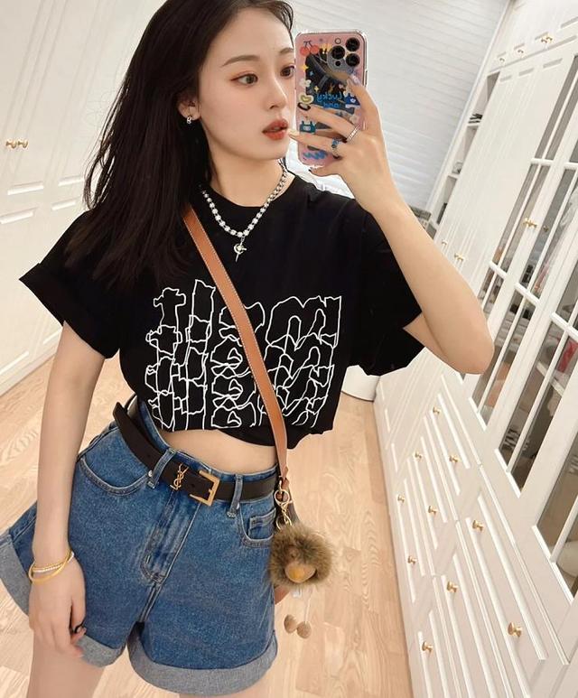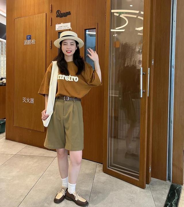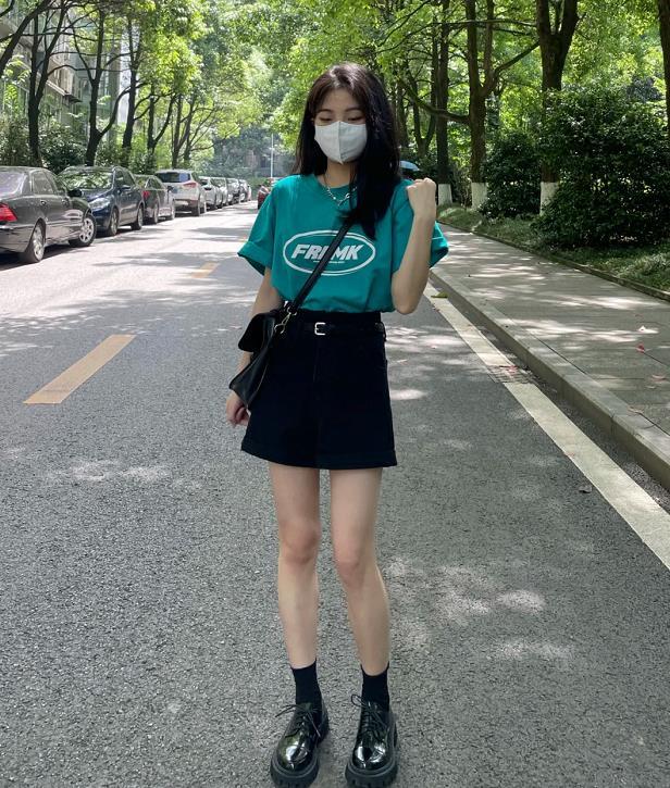 If you are afraid of wearing boring clothes easily, you can learn from the picture below As a Chinese blogger, fold up the hem of your T-shirt to expose the skin on your waist. It looks very sexy and can quickly divert other people’s attention. This time, the bottoms are paired with a pair of cuffed denim shorts. The pants are of moderate width and can hide the fat on your thighs well, making you look slimmer.