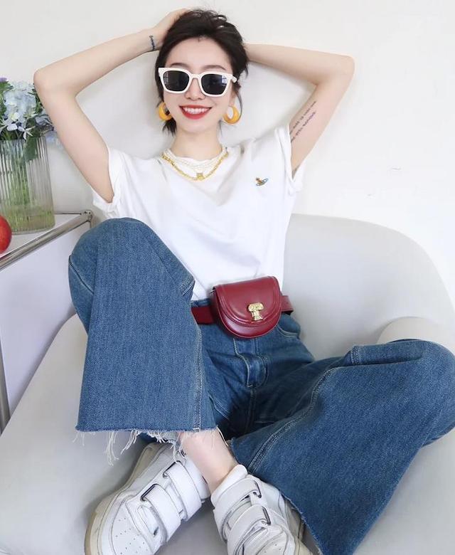 Hey, look at this set. It’s a clean white short-sleeved T-shirt, paired with a pair of denim wide-leg pants. The two colors of white and denim blue are combined together. It is especially suitable for summer, and the white sneakers on your feet are comfortable and echo the white T-shirt.