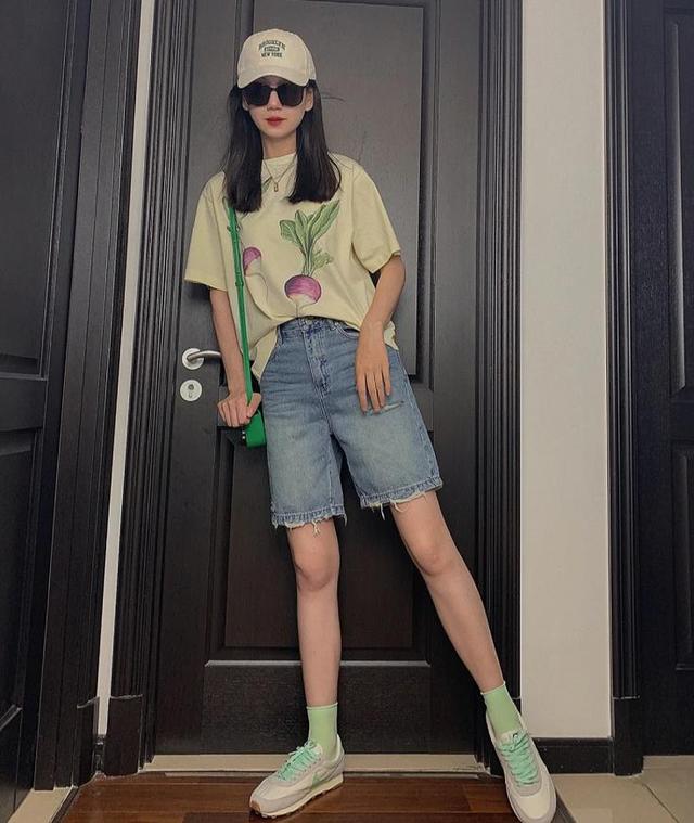 Although items like T-shirts are very versatile , not picky, but if you want to wear it fashionable and stylish, you need to use some matching ideas. The short-sleeved T-shirt with printed patterns is much more fashionable than the solid color version. The denim shorts worn on the lower body are very refreshing and youthful.