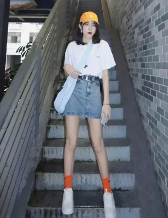 This outfit looks very casual and refreshing, especially suitable for this hot summer. The white T-shirt is very A basic and simple model, but the highlight is at the back. Paired with a denim blue skirt, it looks really fashionable and looks youthful and looks younger. Use orange socks and a hat to embellish it, which makes it look more eye-catching and sunny, making it perfect for going shopping or going on a date.