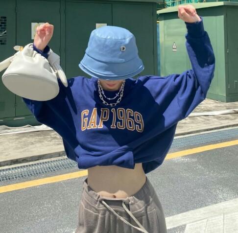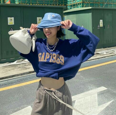 The first outfit is very cool, a blue short sweatshirt, revealing the sexy vest line. The fit of this sweatshirt is also very good, it is sexy and loose, and it has a bit of a hip-hop feel when worn. It’s just right for autumn. The long-sleeved design means it won’t be too cold to wear.