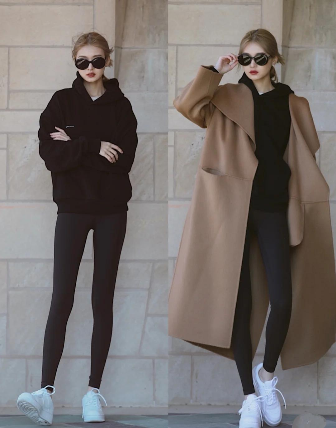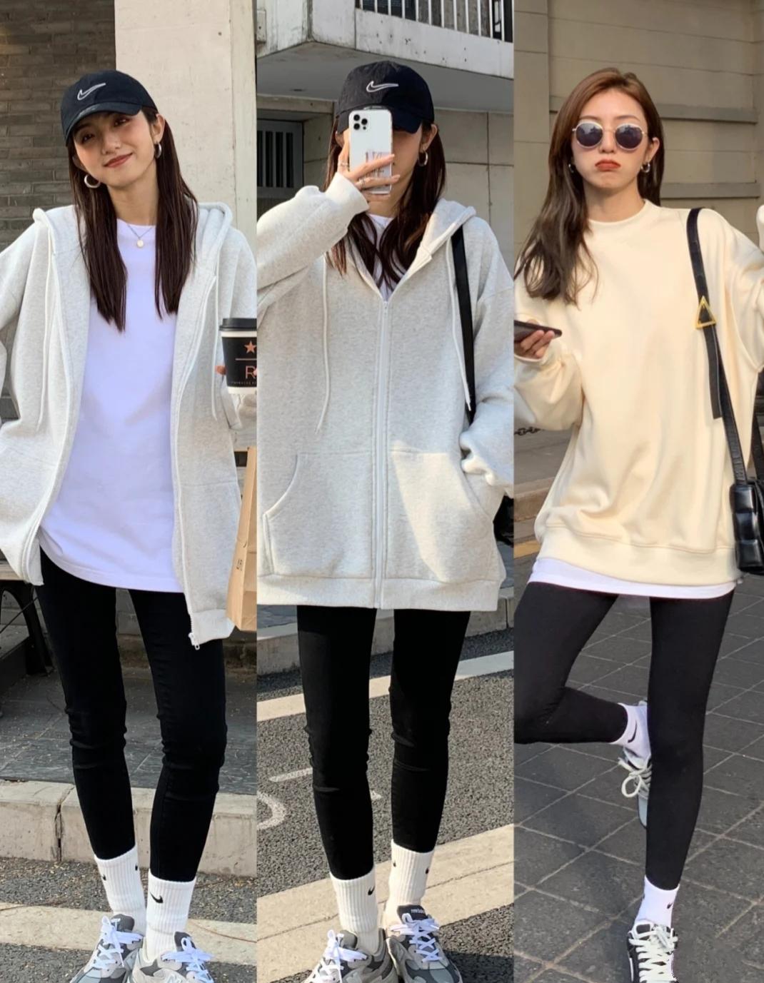 Put a light gray hooded sweatshirt over a white long-sleeved T-shirt, and wear black leggings on the lower body to create a wide-top look and a tight-fitting bottom. Pair it with a pair of dad shoes and socks to look fashionable and energetic.