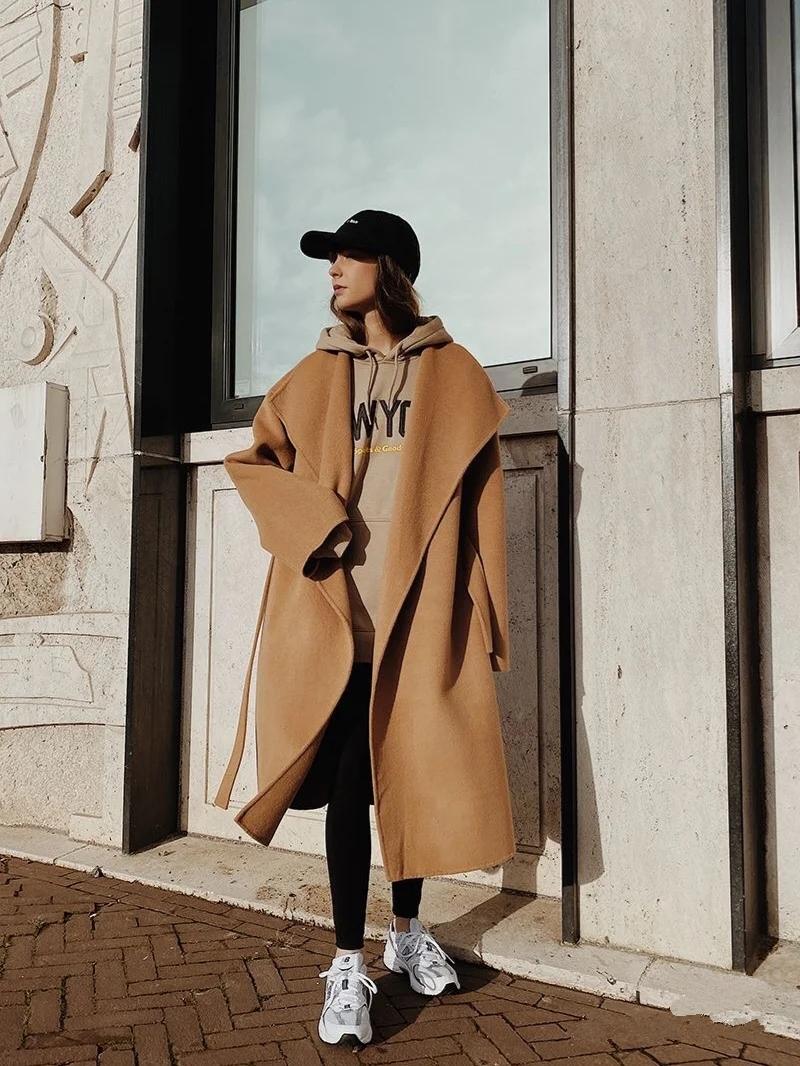 The oversized camel long coat with large lapels is layered over a khaki hooded sweatshirt. The inside and outside form different shades of earth tones, which are clearly layered without losing a sense of coordination.