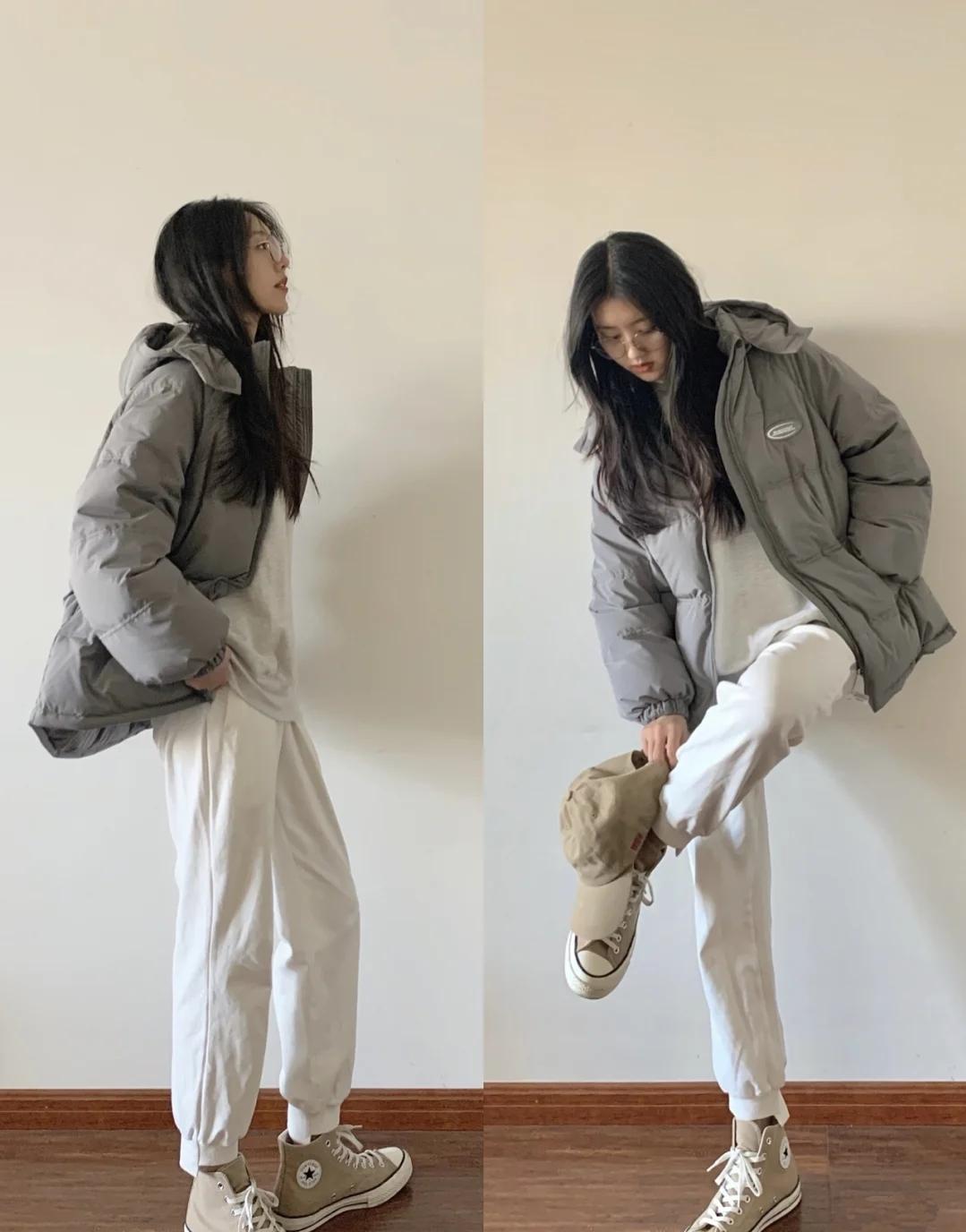 A gray short down jacket is layered with a casual sweatshirt. The leg-tie white pants on the lower body are connected to high-top canvas shoes. On the one hand, the leg-tie white pants It highlights the slender ankle area and thus plays a slimming role. On the one hand, the loose white pants are also very tolerant to the shape of the legs.