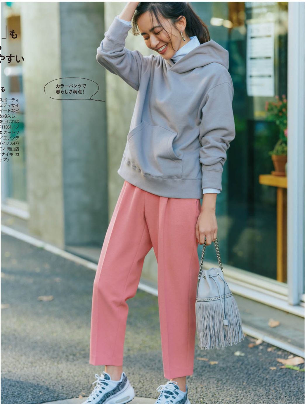 Pairing a sweatshirt with trousers may be a more common way of wearing it. When matching like this, we must consider the coordination of colors. Spring is the time when everything revives. It’s the season, so I recommend you to choose some bright-colored items.
