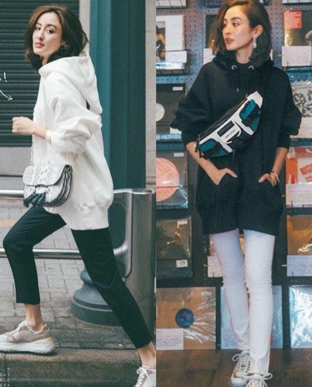 If you are a tall girl with a pear-shaped figure, then a mid-length sweatshirt is very suitable for you. Use a mid-length sweatshirt on the upper body. The crotch and thigh roots are covered to perfectly digest the small flaws on the figure. The lower body is paired with a slim-fitting style of pants, which not only accommodates the small flaws of the figure but also shows the slenderness of the legs.