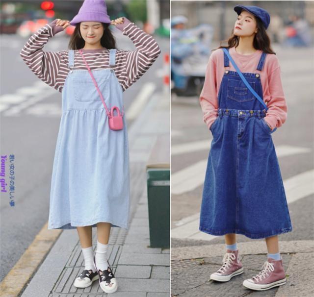If you want to look younger, you can also try pairing a bright-colored sweatshirt with a suspender skirt. Partially bright colors are paired with a suspender-style denim long skirt. The whole-body combination is both eye-catching and sweet, and full of girlishness.