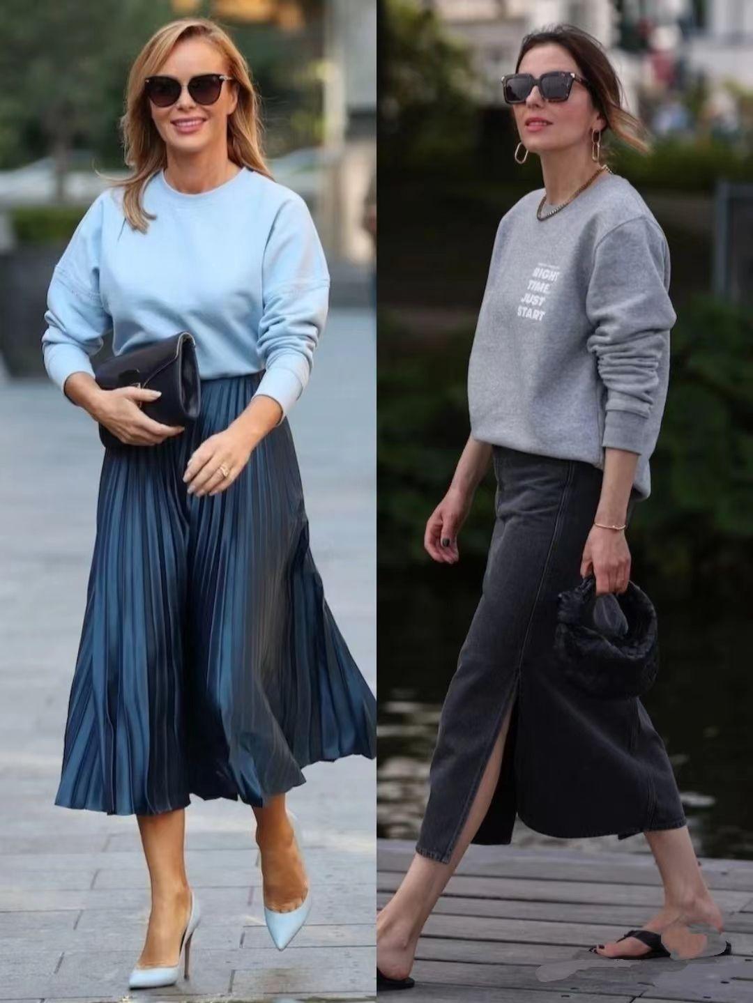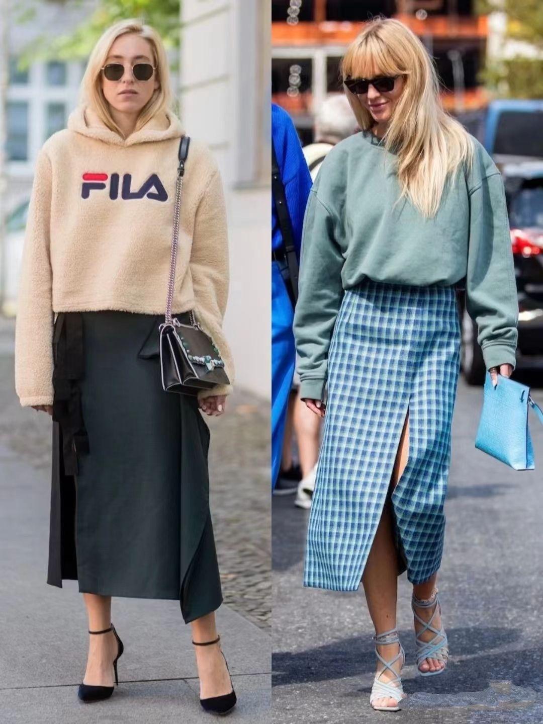 Pair it with a half-length skirt Sweatshirts are one of the more eye-catching ways to wear them. There are many types of skirts, and many styles of long skirts can create a style collision with sweatshirts, bringing unexpected surprises.