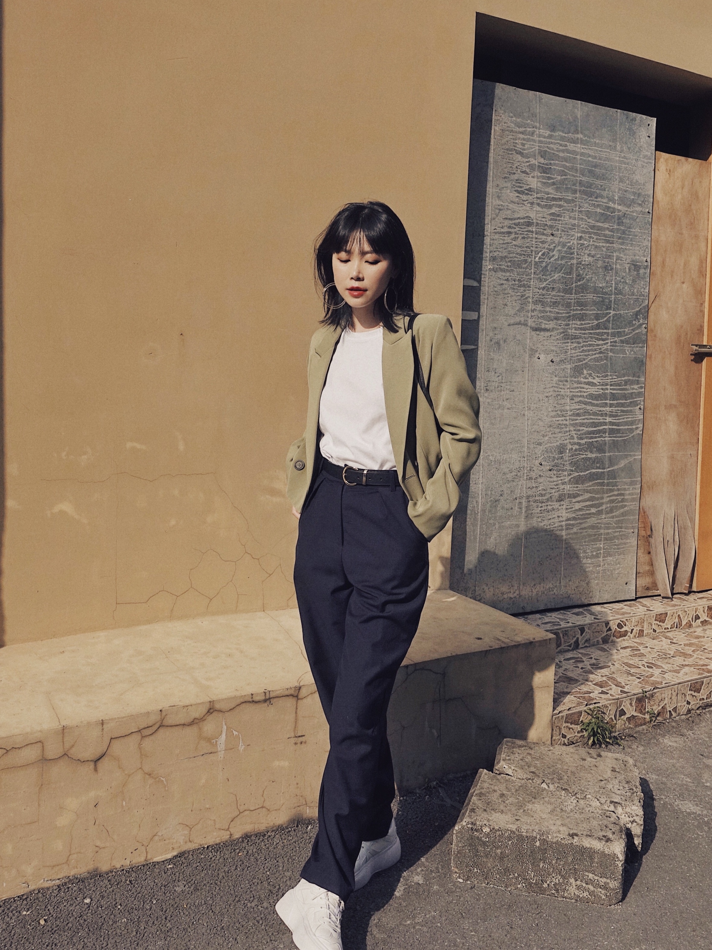 Cool girls can also use white T-shirts to create a casual street style. Short suits with unique designs are rare styles. Khaki suits are not only versatile but also look very elegant when paired with a white T-shirt. The tailoring of the suit with a large neckline keeps it from being too formal, and the small decorative details of the tortoiseshell buttons are a plus.
