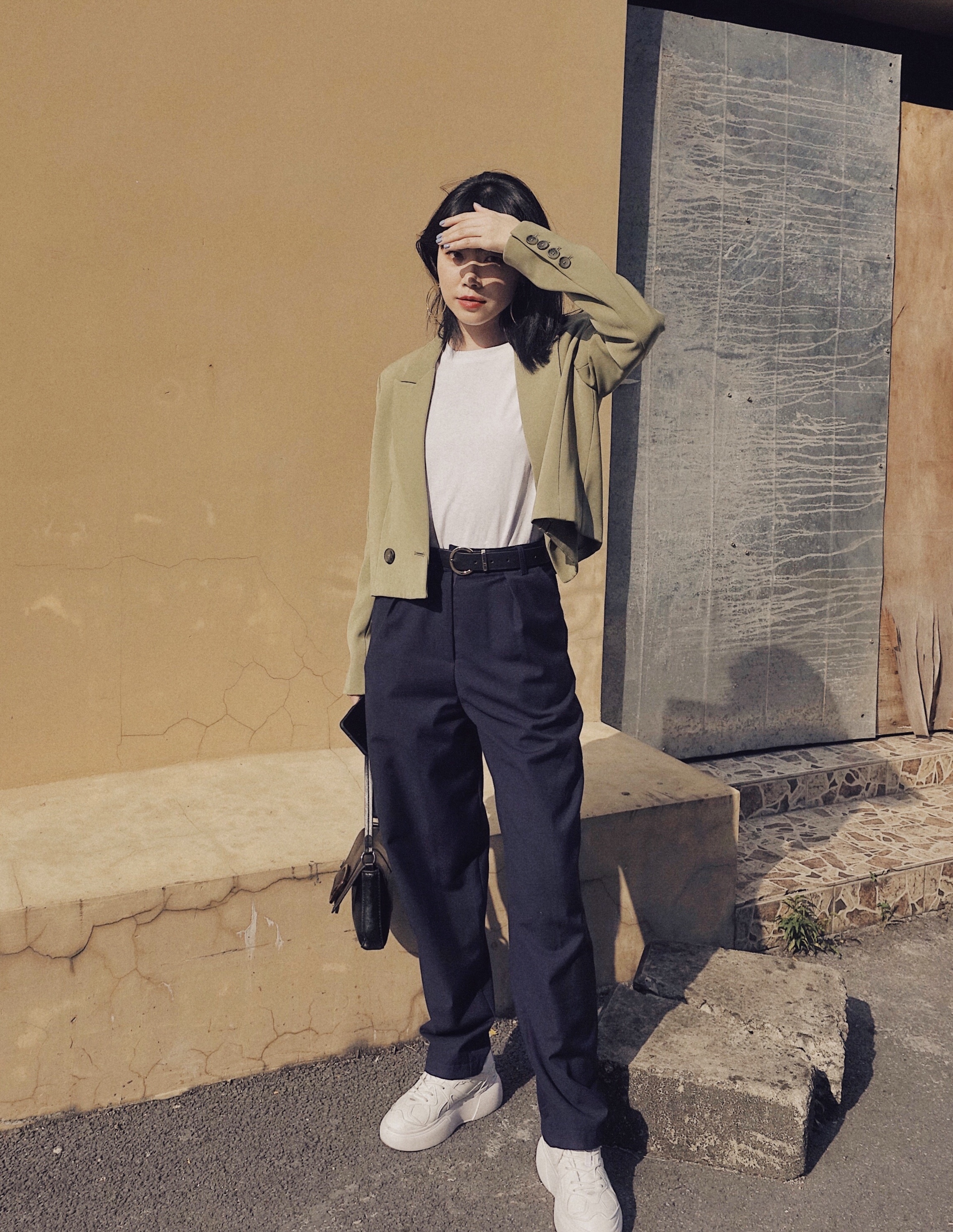 The black trousers worn with the lower body are straight-leg trousers that are very popular nowadays. The straight-leg version will make the legs longer and the suit fabric will make the trousers drape stronger. The high-waisted trousers can improve the proportion of the body. The metal belt adds to the overall look. Stylish white shoes are not only versatile but also comfortable and convenient for daily outings and work.