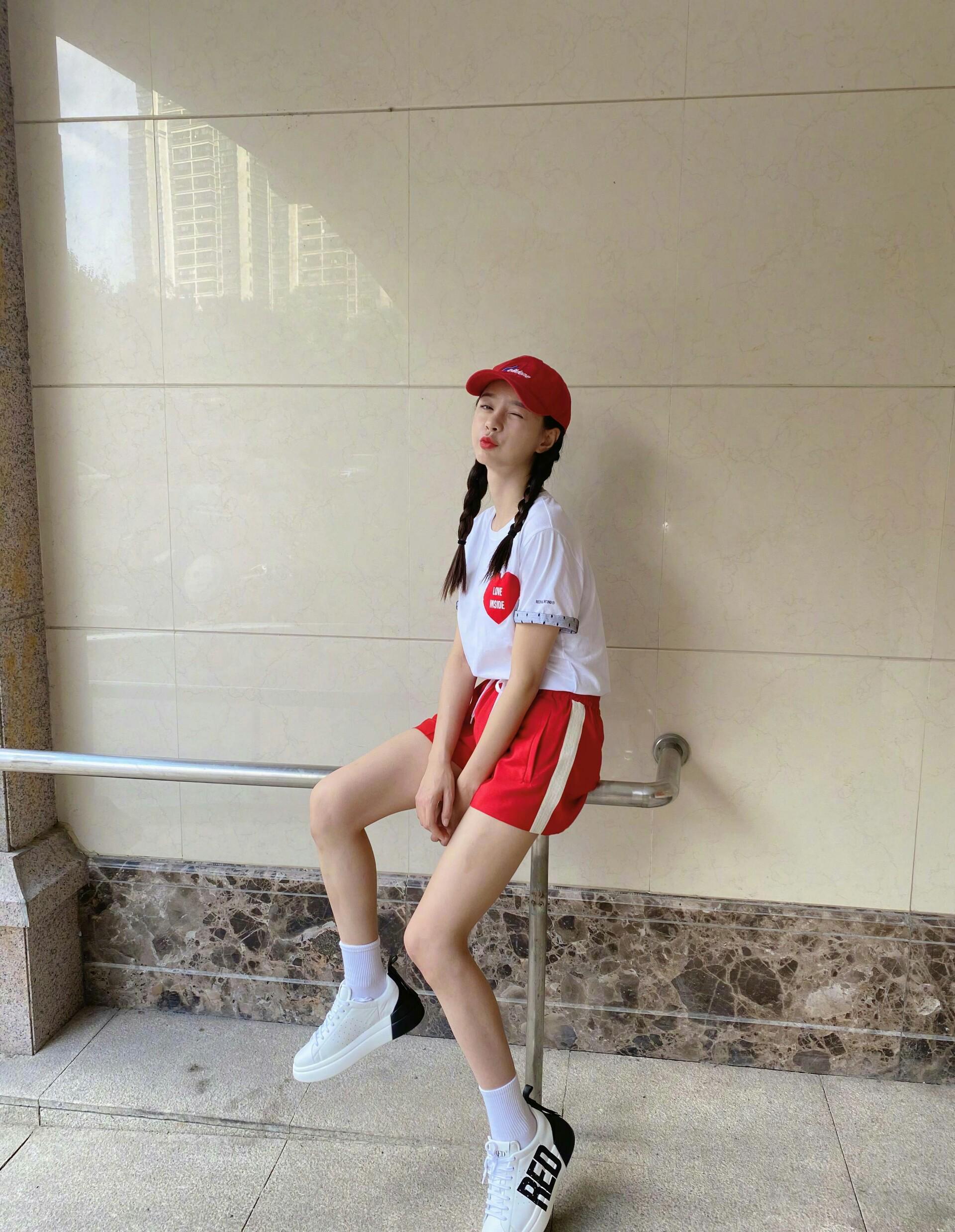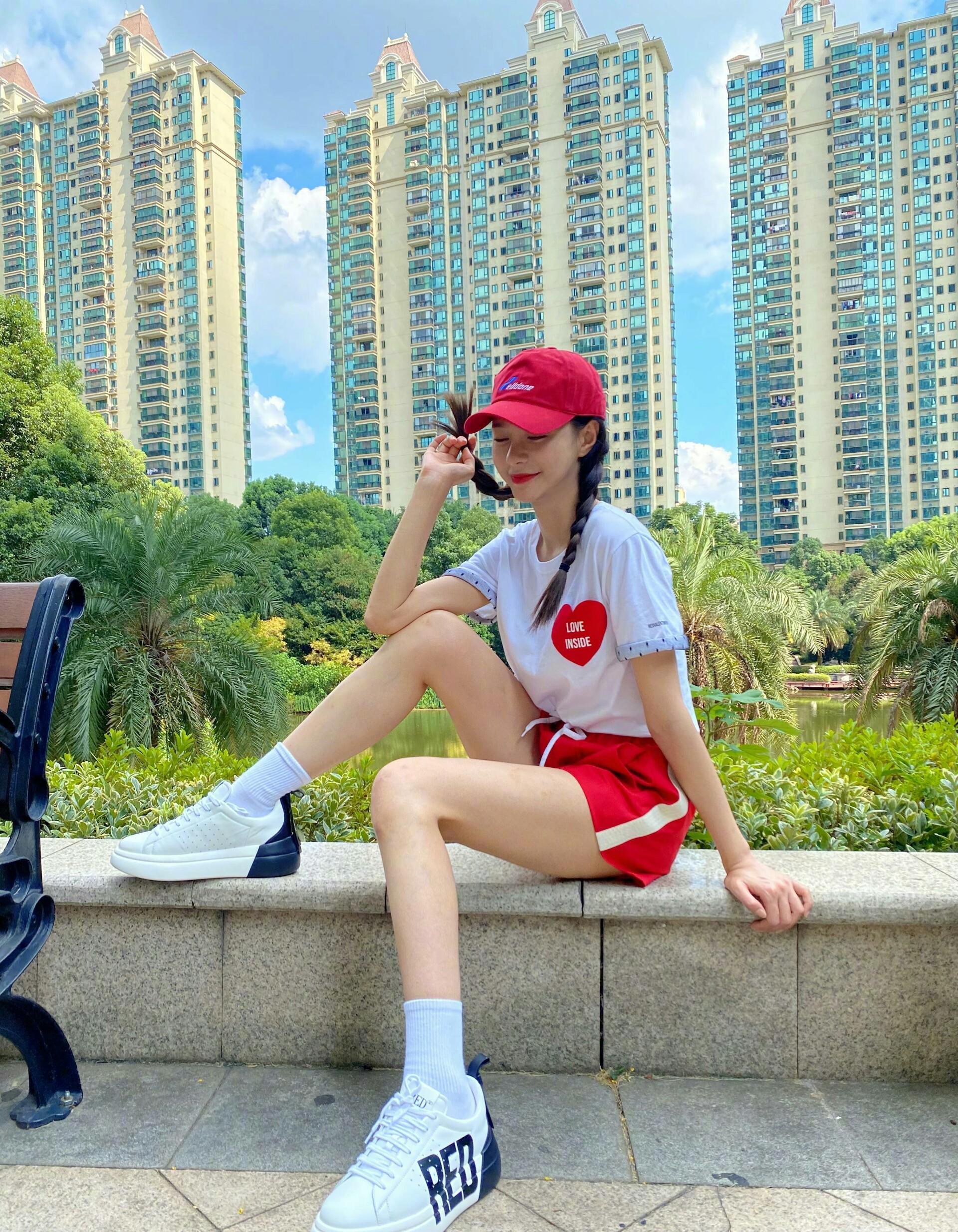 The lower body is matched with a pair of red shorts with white stripes on the side. In an inexplicable echo with the color of the upper body, these sports shorts feel great and paired with a pair of white shoes, they are even more pure and charming. The overall look of this outfit is very clean and neat, and we can choose it when we exercise or go shopping. On the one hand, it is comfortable, and on the other hand, it is not lacking in fashion at all. It is very eye-catching and I believe the rate of return must be high. Moreover, this set of clothes is suitable for girls of all shapes and sizes and can be freely chosen.