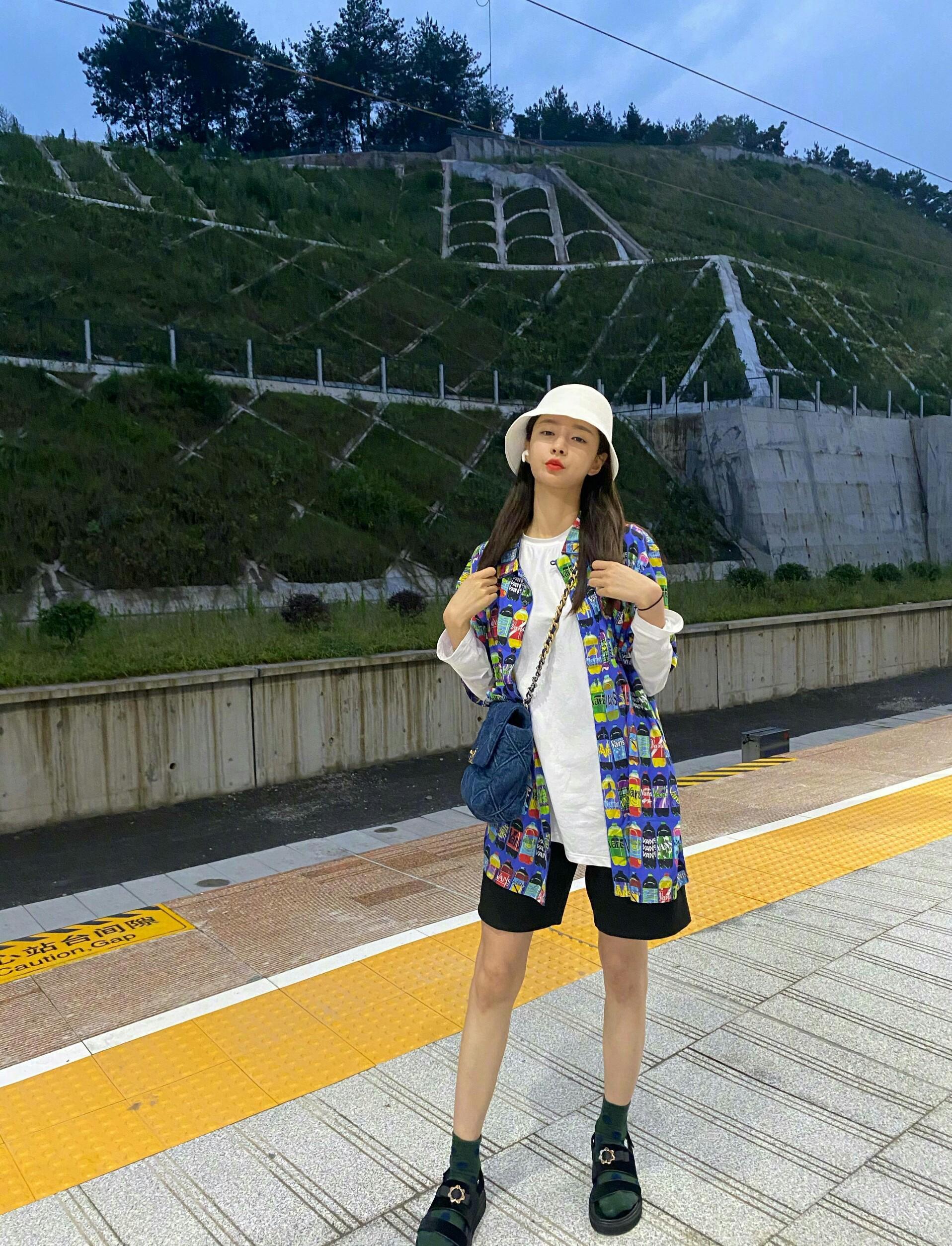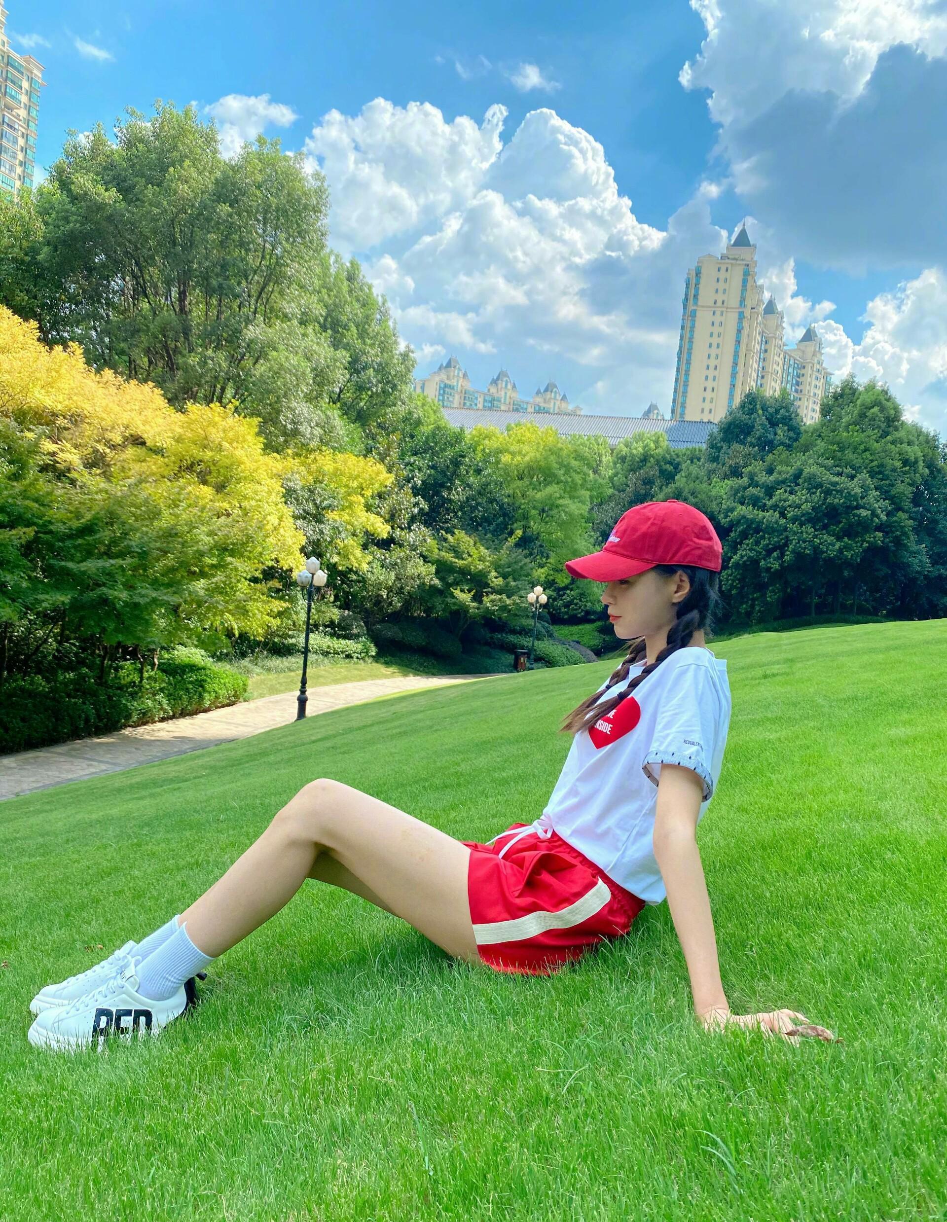 The first set is that Shen Mengchen posted his latest photos on Weibo, with blue sky, white clouds, and green On the grass, Shen Mengchen was particularly bright. This outfit is very eye-catching as a whole. The red baseball cap and red shorts are very eye-catching. The red clothes and the green grass form a huge contrast, so this bold attempt is not a bad idea. A different spark came out of the collision.