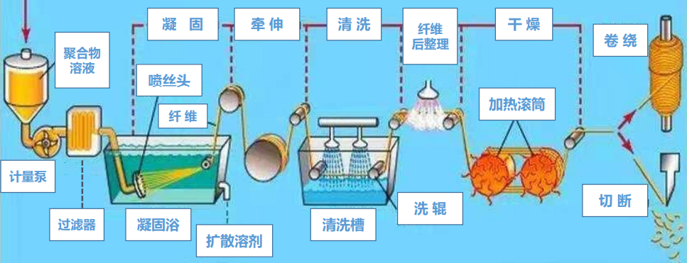 Regenerated fiber is made from natural polymers as raw materials and processed Chemical fibers whose chemical composition is the same as that of the raw materials. Regenerated fibers mainly include viscose fiber, bamboo pulp fiber, Lyocell fiber, modal fiber, cupro, acetate fiber, etc. The chemical composition of these raw materials is the same as that of cotton and wool. It is just that the shape and size cannot be woven, so they need to be “regenerated”. The following is a schematic diagram of the wet spinning process of regenerated fiber. It can be seen that the safety of this type of material depends on the process.