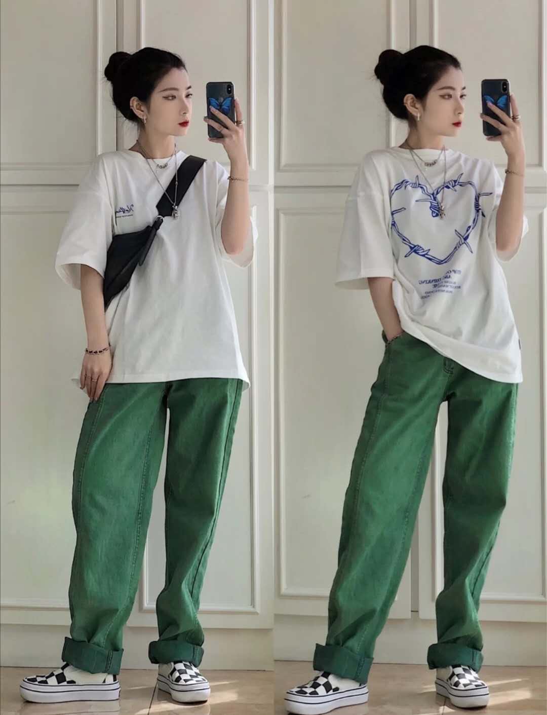 Simple Basic white T-shirt outfits for girls that will make your heart beat: a white T-shirt with a blue pattern in the middle, fresh and versatile, simple and elegant, ripped denim with a loose fit, high-waisted wide-leg pants that cover the flesh and look slimming, and big holes It’s very cool to wear in summer. Paired with a simple white T-shirt, it’s a super comfortable outfit. Dad shoes go perfectly with floor-length jeans.